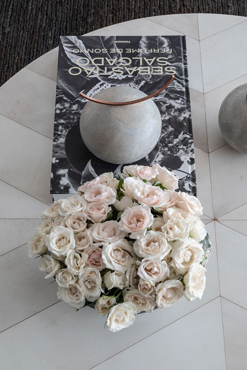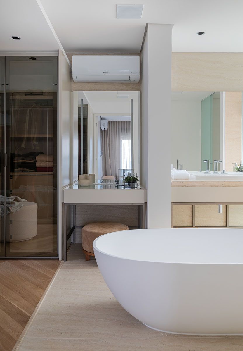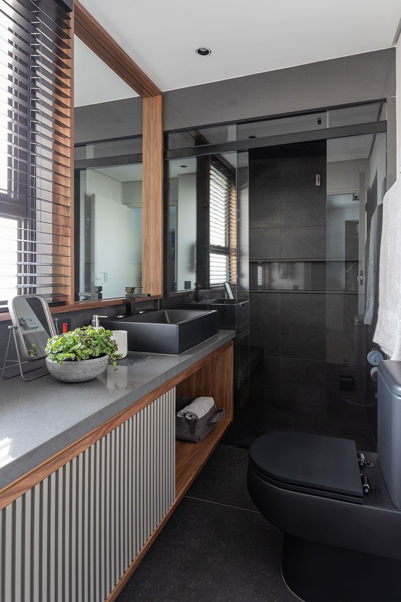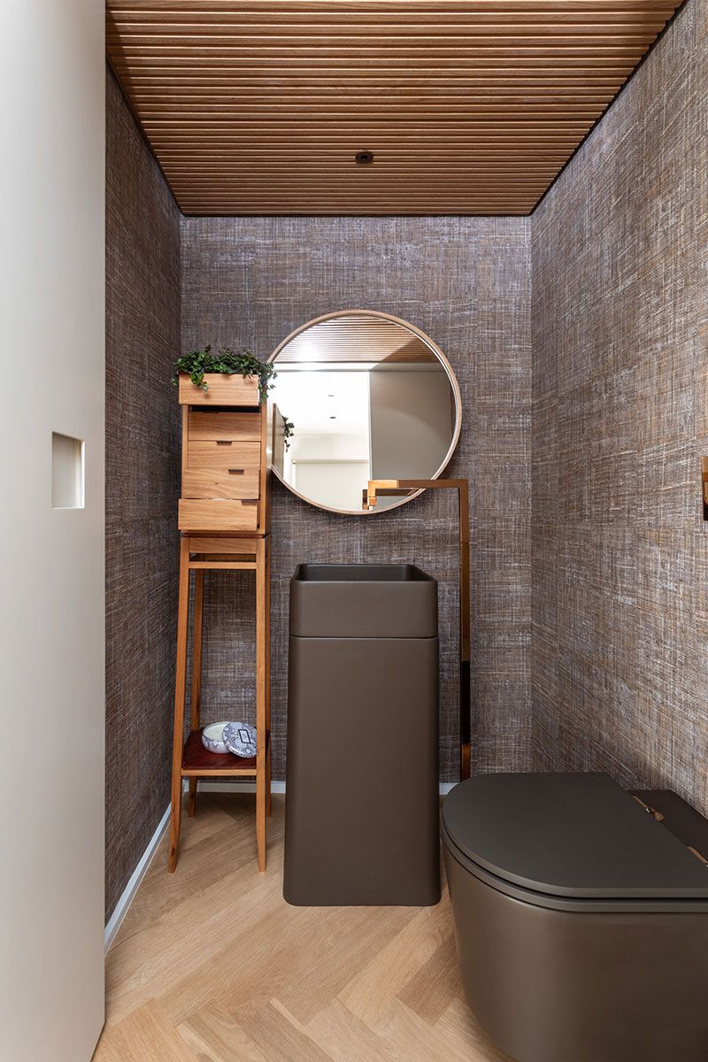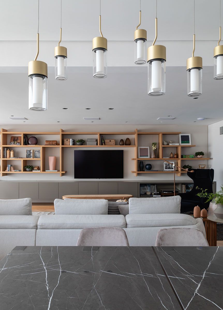 Foi utilizado o mesmo revestimento de piso nos ambientes sociais, inclusive no lavabo, para dar mais amplitude aos espaços. Além disso, os profissionais optaram pelo rebaixamento de gesso para resolver os problemas de iluminação e de som dos ambientes.
