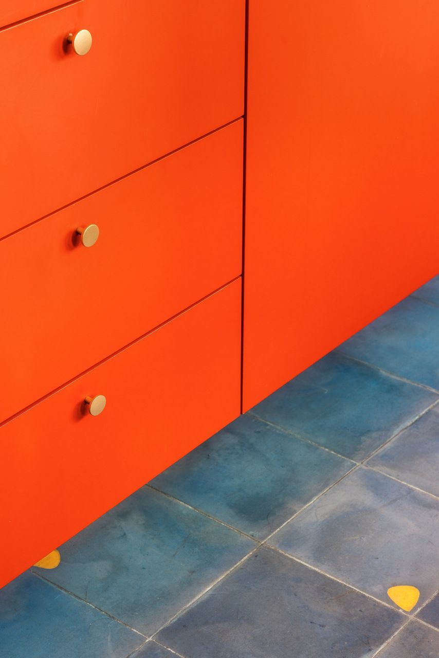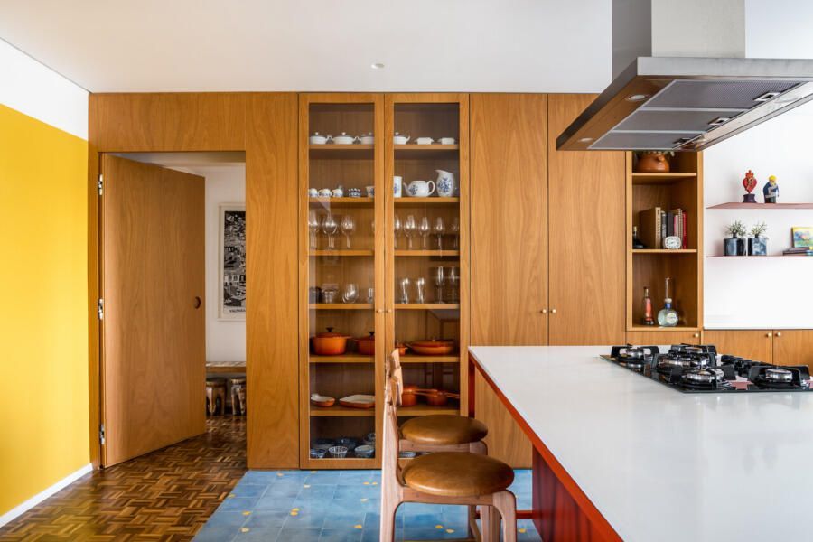 O piso de taco existente foi preservado e revitalizado — a única permanência estrutural do apartamento original — tornando-se a base afetiva da nova composição. Nas áreas sociais, a madeira conversa com paredes em terracota e mostarda, criando planos quentes que aquecem a luz natural. Já na cozinha, o ladrilho hidráulico azul introduz uma pausa cromática inesperada, em contraste com a ilha avermelhada executada em serralheria. Painéis e armários de madeira percorrem os ambientes integrados, conectando-os visualmente e garantindo unidade.