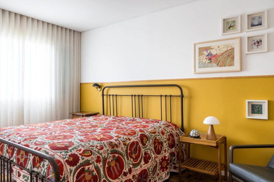 O apartamento conta com duas suítes. A master mantém diálogo com a área comum ao repetir o tom mostarda na parede, reforçando a coerência da paleta, e incorpora o ladrilho hidráulico na área de banho, ampliando a narrativa material. A segunda suíte foi desenhada a partir da versatilidade: funciona como escritório no cotidiano e, quando necessário, transforma-se em quarto de visitas graças à cama embutida no armário planejado. Uma solução inteligente que preserva área livre sem abrir mão do conforto.