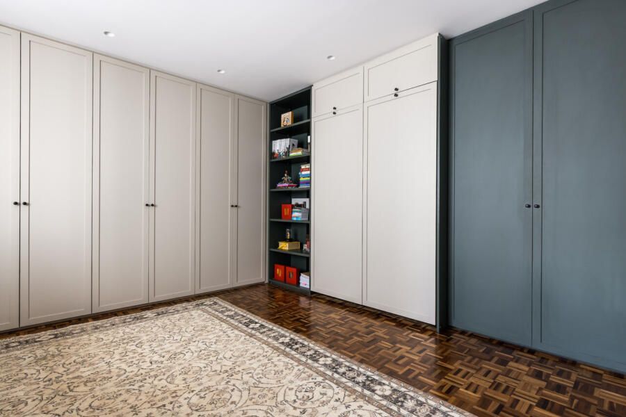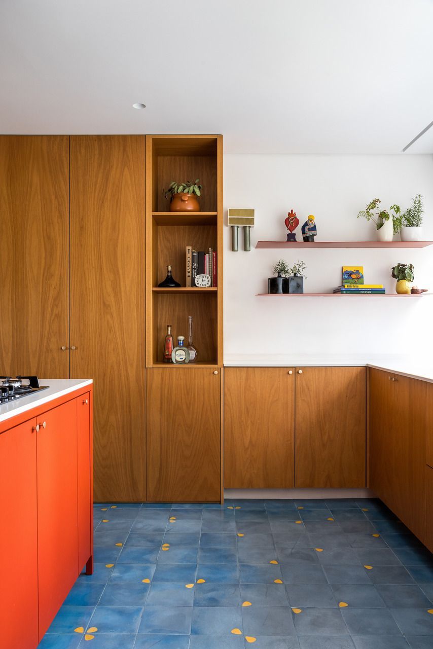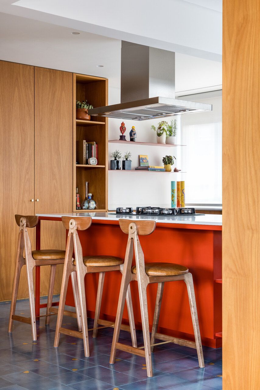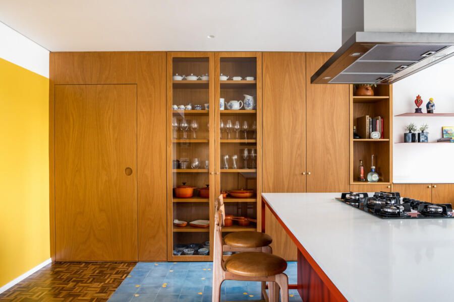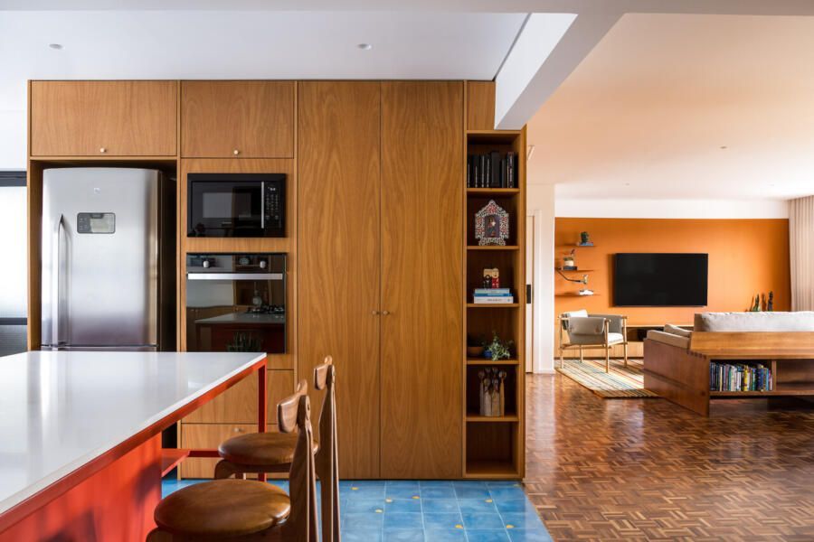 O piso de taco existente foi preservado e revitalizado — a única permanência estrutural do apartamento original — tornando-se a base afetiva da nova composição. Nas áreas sociais, a madeira conversa com paredes em terracota e mostarda, criando planos quentes que aquecem a luz natural. Já na cozinha, o ladrilho hidráulico azul introduz uma pausa cromática inesperada, em contraste com a ilha avermelhada executada em serralheria. Painéis e armários de madeira percorrem os ambientes integrados, conectando-os visualmente e garantindo unidade.