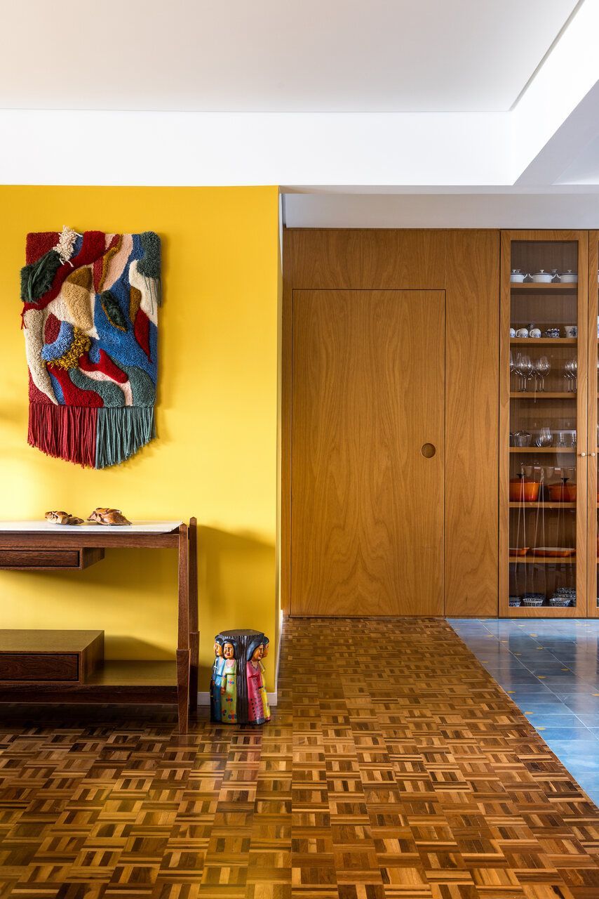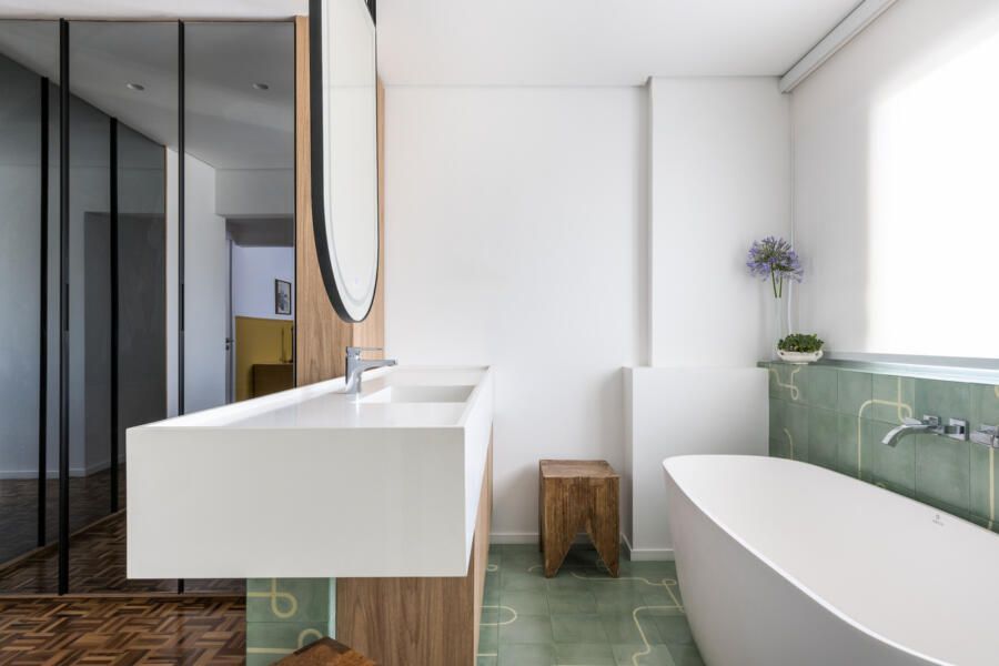“Outra questão da qual eu fazia muita questão, e que os arquitetos respeitaram bastante, foi o uso da madeira. O piso de taco era a base do apartamento e foi a única coisa mantida. E, nossa, ainda bem, porque eu adoro esse piso e ele ficou lindo combinado com o ladrilho hidráulico!”