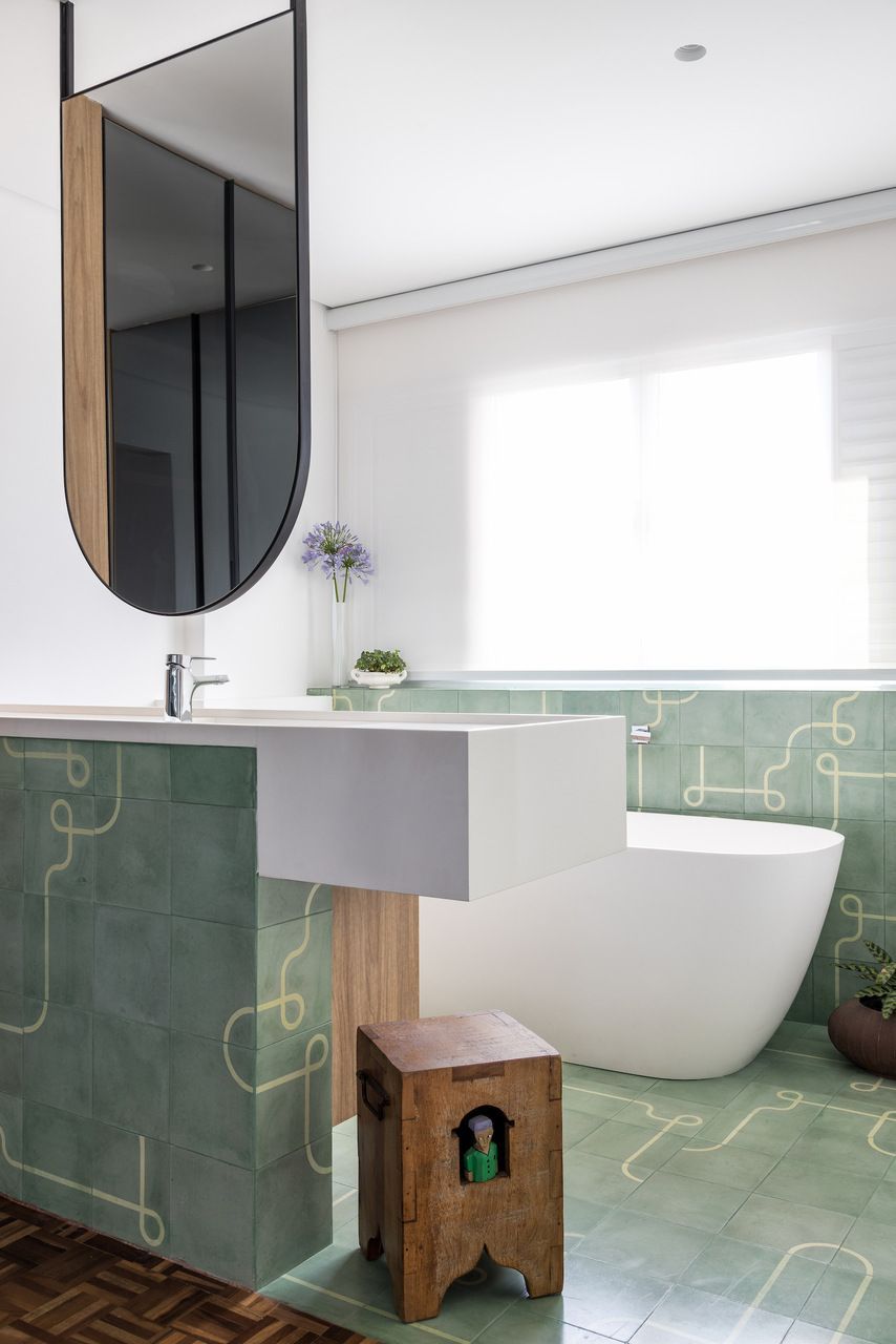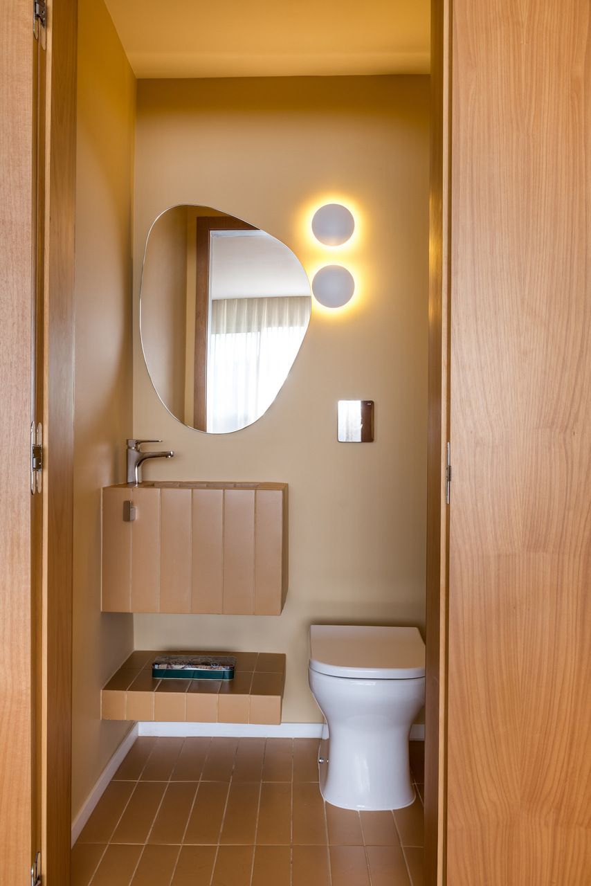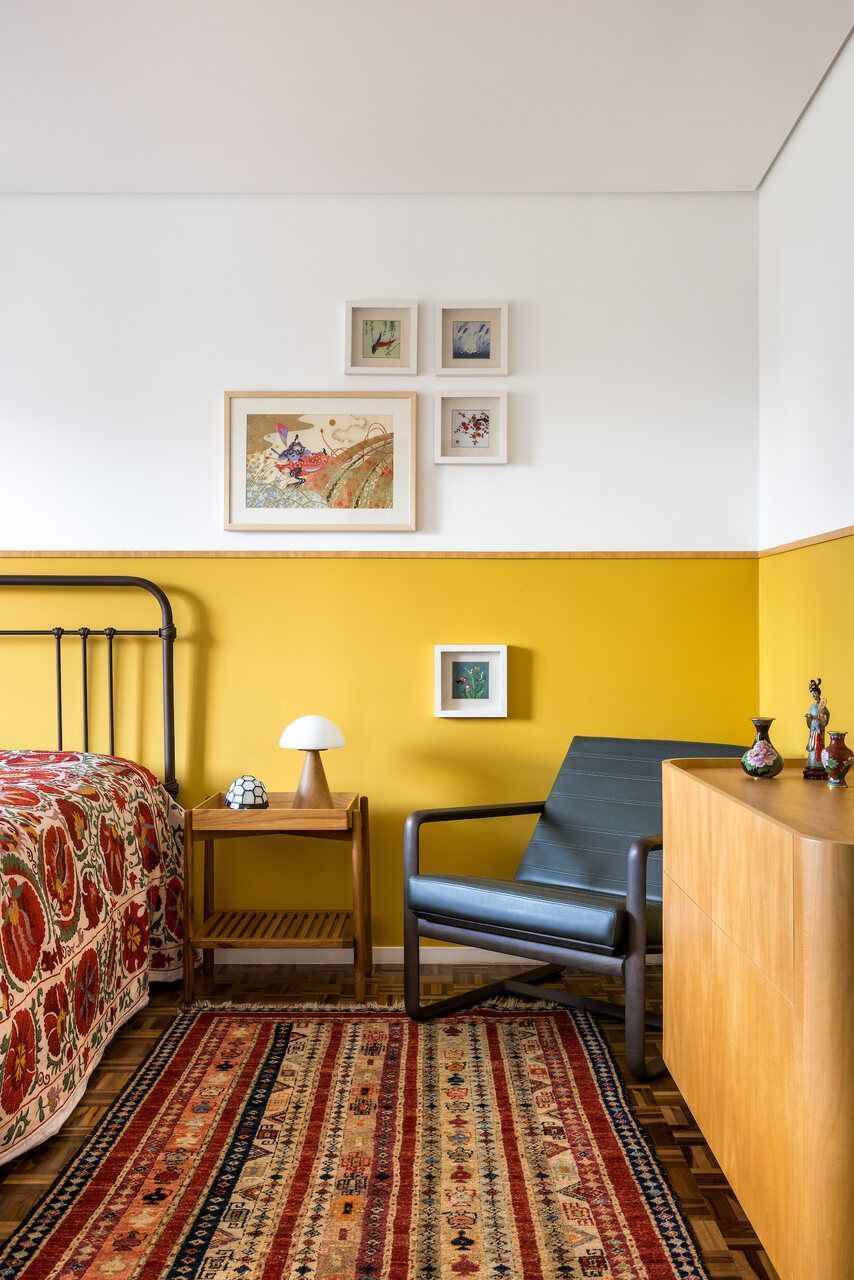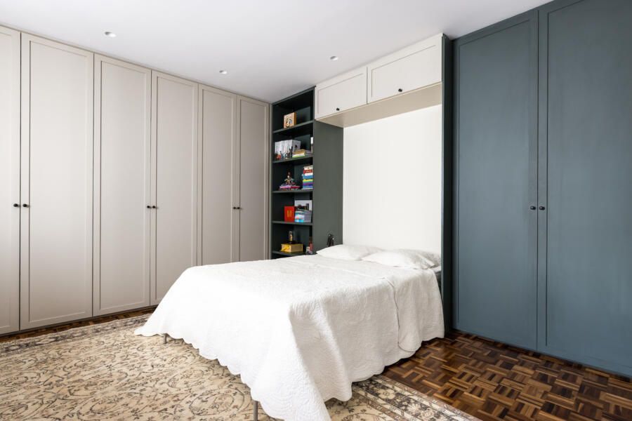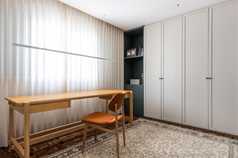 O apartamento conta com duas suítes. A master mantém diálogo com a área comum ao repetir o tom mostarda na parede, reforçando a coerência da paleta, e incorpora o ladrilho hidráulico na área de banho, ampliando a narrativa material. A segunda suíte foi desenhada a partir da versatilidade: funciona como escritório no cotidiano e, quando necessário, transforma-se em quarto de visitas graças à cama embutida no armário planejado. Uma solução inteligente que preserva área livre sem abrir mão do conforto.