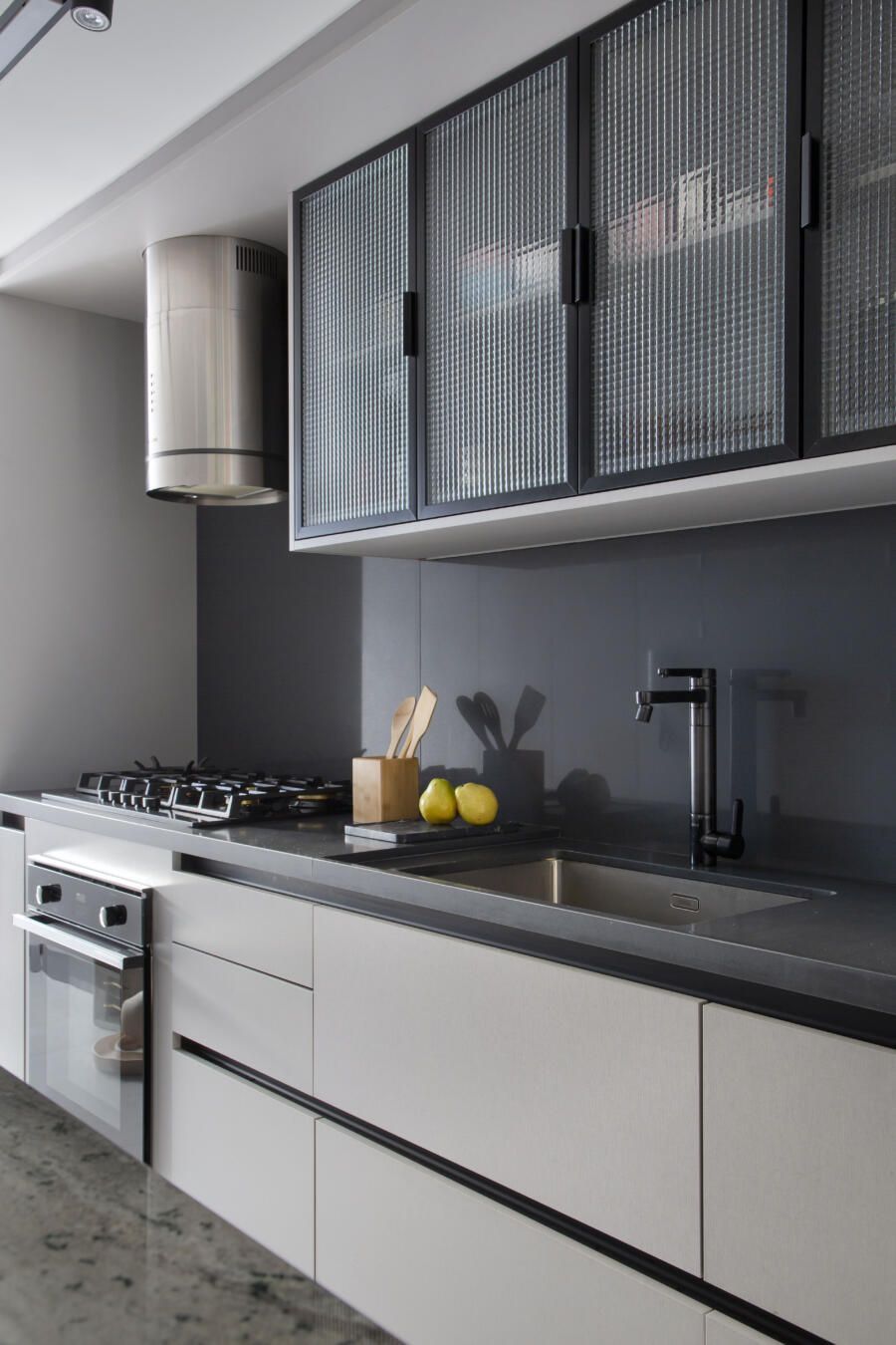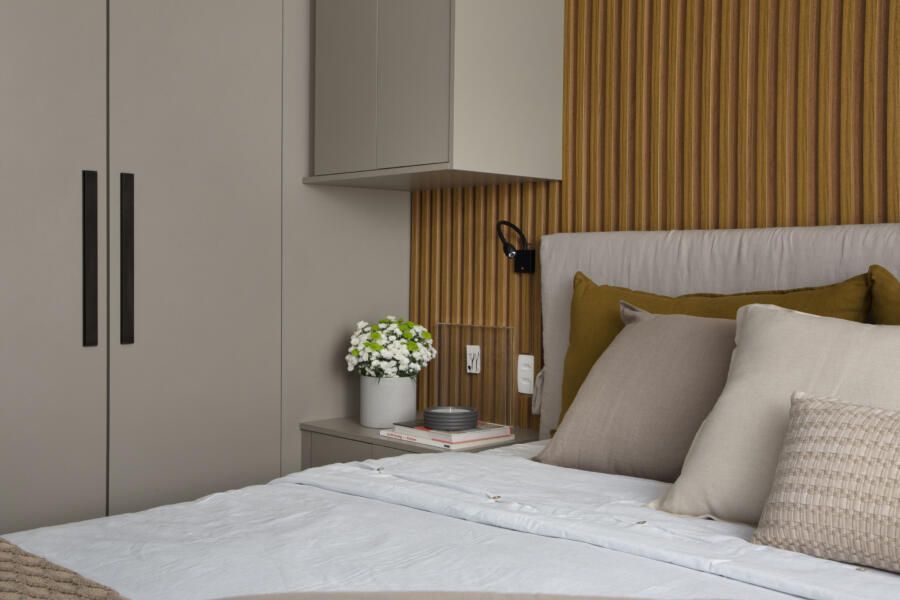 “A varanda foi fechada com vidros modelo sacada e anexada à sala para ampliar um pouco mais a área social, onde antes mal cabia um sofá de 3 lugares, e a cozinha foi integrada à sala. Além disso, ao isolar a varanda da suíte do casal com vidro, o quarto ganhou um precioso espaço extra de 1 metro, permitindo a instalação de mais armários, closet e uma cama queen size.”