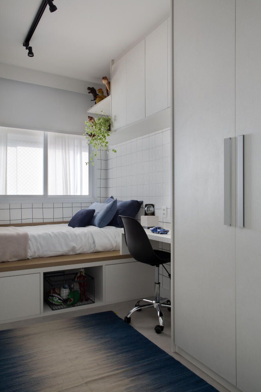 “No quarto do filho, de apenas 8m², coube armário, uma bancada, cama, televisão, e sobrou até um espaço para ele brincar. Tudo isso graças às soluções bem boladas em marcenaria.”