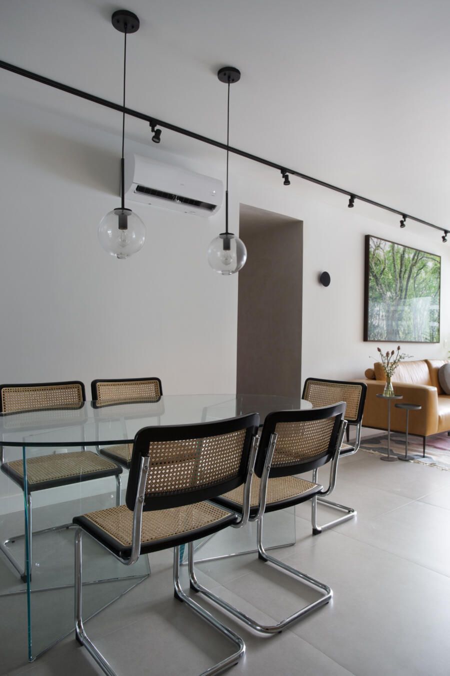 “Os trilhos pretos de iluminação fixados no teto da sala, por exemplo, ajudaram a criar uma atmosfera sutilmente industrial.”