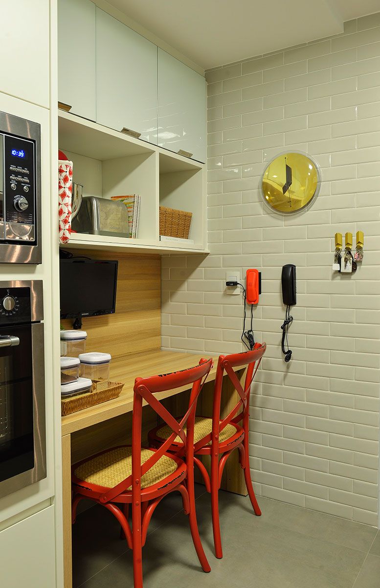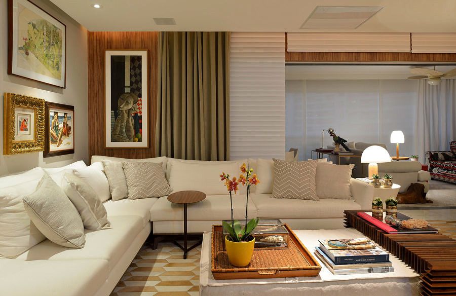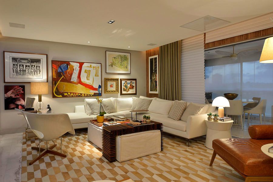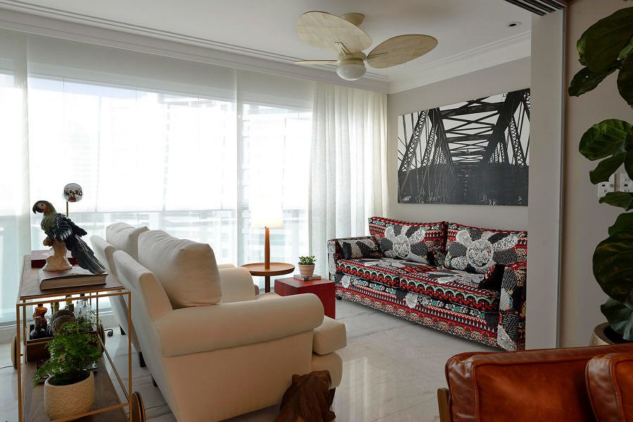 O escritório optou pelo contraste do claro com tons fortes e crus dos móveis e outros detalhes que fizeram o apartamento ficar exatamente com a “cara” da proprietária. Toques na decoração também foram essenciais para isto, já que a proprietária é fanática por viagens e sempre traz objetos de decoração ou até mesmo móveis que conversam totalmente com todo o ambiente.