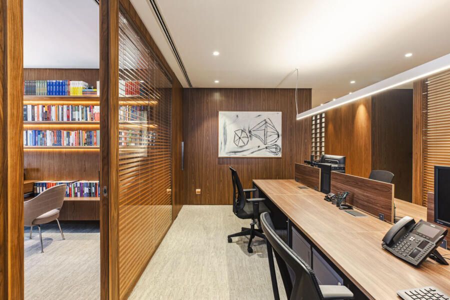 A organização dos percursos internos foi um dos pontos centrais do projeto. Dois caminhos distintos, um para clientes e outro para funcionários, garantem privacidade absoluta e praticidade no dia a dia. A circulação estrutura o escritório em dois grandes blocos: de um lado, o setor dos advogados e colaboradores, com estações amplas, iluminação linear contínua, tratamento acústico e marcenaria em nogueira, que imprime ritmo ao espaço e adiciona um acolhimento discreto.