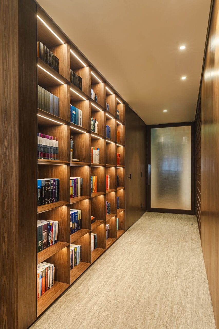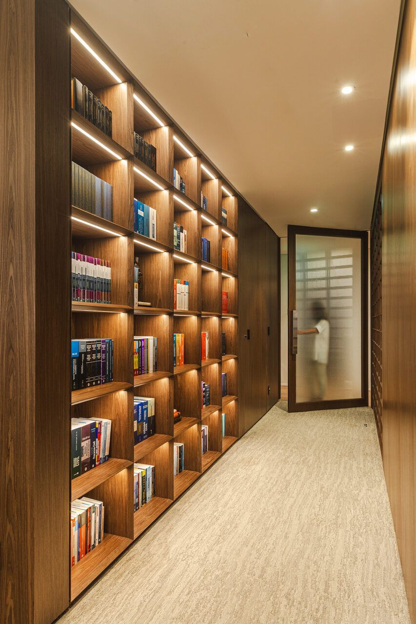 A materialidade reforça a identidade do escritório de arquitetura. A madeira nogueira assume papel central, trazendo textura, seriedade e calor na medida certa. O carpete e os painéis revestidos em tecido asseguram conforto acústico, enquanto divisórias e caixilhos de alto desempenho completam o isolamento necessário. A iluminação combina perfis lineares, pontos de destaque nas estantes e áreas com tensoflex, oferecendo luz difusa, homogênea e sem sombras, ideal tanto para reuniões presenciais quanto virtuais.