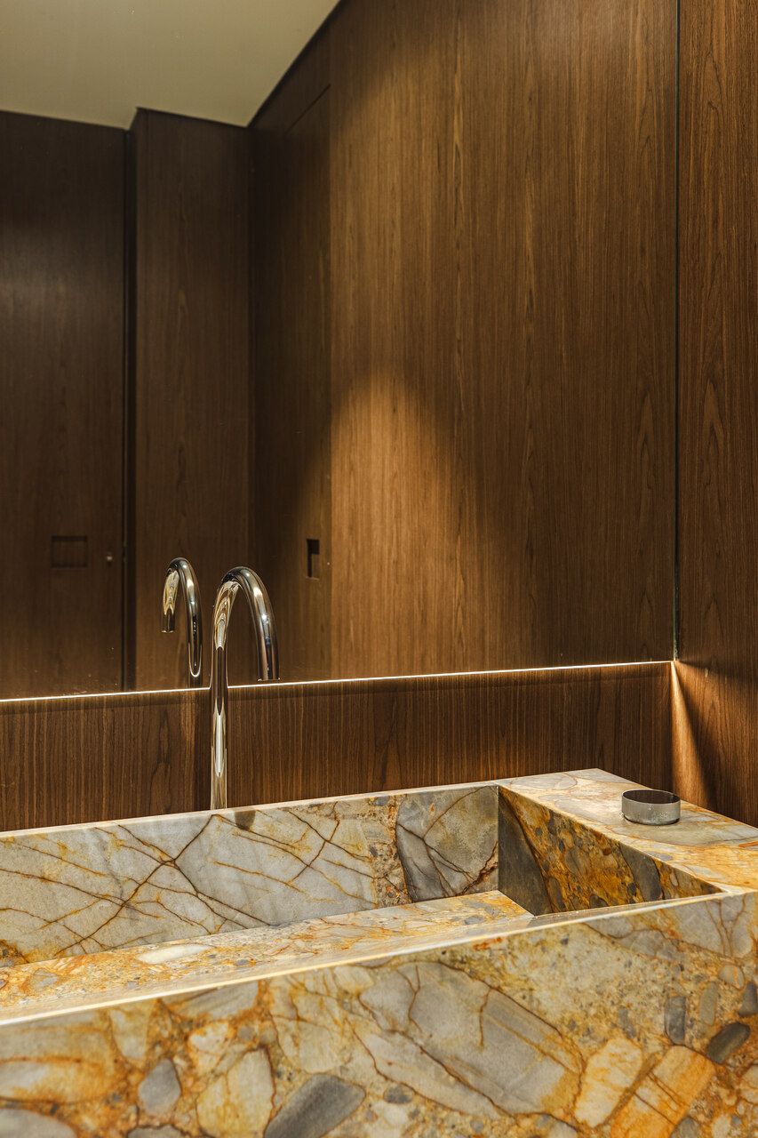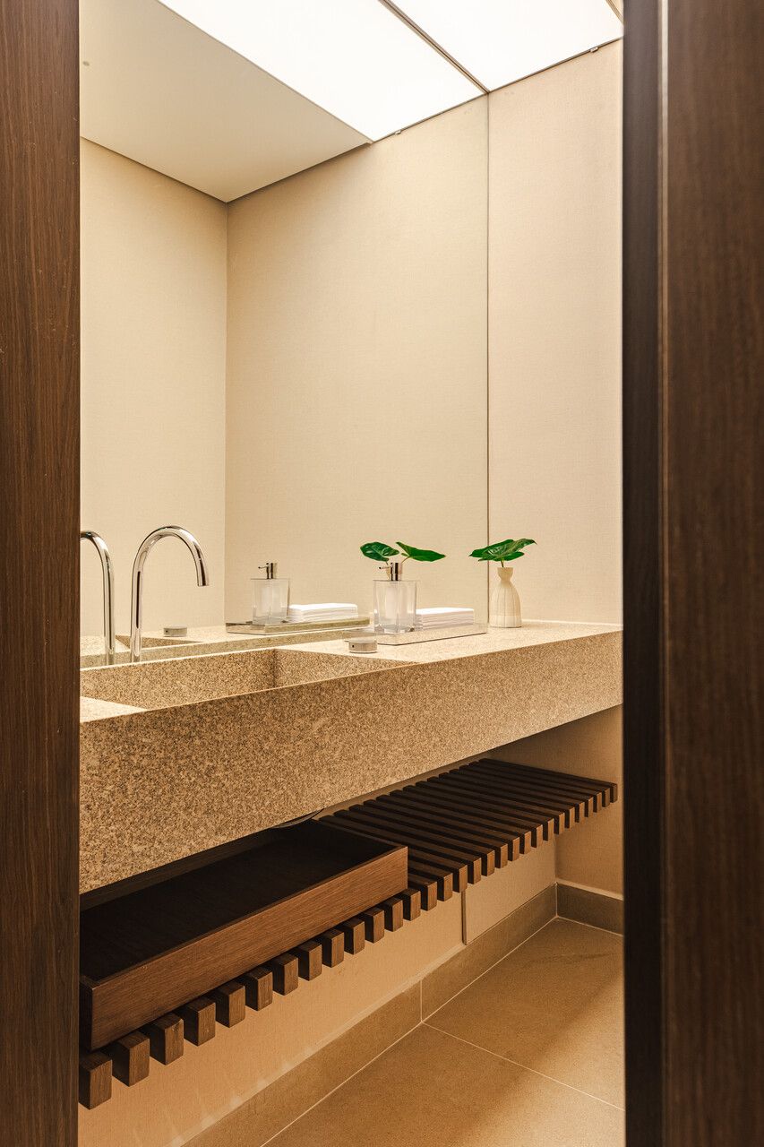 A marcenaria, desenhada sob medida, organiza sem se impor. Soluções como a copa integrada e mimetizada, revelada apenas quando necessário, e os aparadores discretos nas salas de reunião evidenciam o cuidado nos pequenos gestos. O escritório conta com seis salas fechadas para advogados, um setor central dedicado ao staff e uma sala principal que reúne biblioteca privativa, lavabo, ampla área de trabalho e acesso exclusivo à varanda. No lavabo social, o mármore Via Appia se destaca na bancada e na cuba esculpida, peça única que equilibra simplicidade e presença. Com escolhas sustentáveis, como drywall, isolamento acústico em LUD PET reciclado e iluminação LED, o projeto se consolida como a síntese de um escritório de grande porte com alma de boutique: sofisticado sem excessos, técnico sem perder humanidade, preciso em cada decisão.