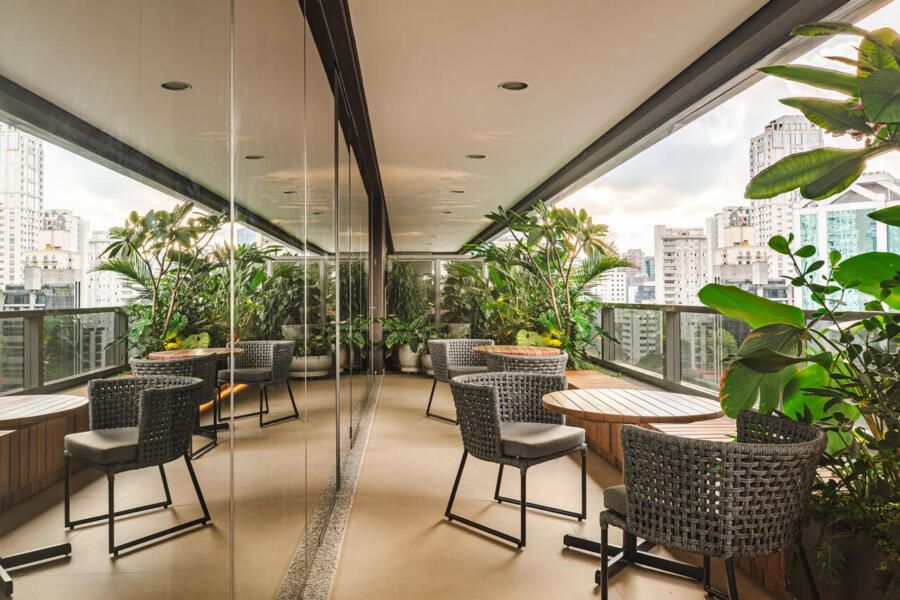 No bloco oposto, estão as três salas de reunião e a sala do advogado principal, todas voltadas para a varanda. A vegetação densa assinada por SEIVA Paisagismo funciona como um filtro natural da vista urbana, trazendo frescor, privacidade e uma conexão constante com o exterior. A floreira contínua, com vegetação tropical e irrigação automática, garante a presença do verde ao longo de todo o ano e contribui para equilibrar a intensidade da rotina profissional.