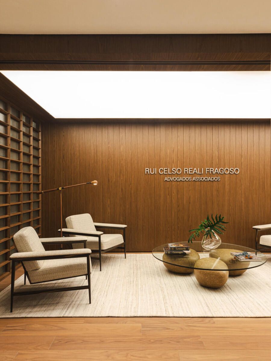 Os desafios do projeto surgiram ainda na fase de concepção, com prazos enxutos e decisões tomadas em paralelo à obra. Nesse contexto, o alinhamento total com a engenharia, assinada por Hauz Engenharia, foi determinante. A execução precisa permitiu que cada material, cada junção e cada detalhe se concretizassem exatamente como previstos, alcançando o nível de rigor técnico exigido por um escritório jurídico dessa escala.