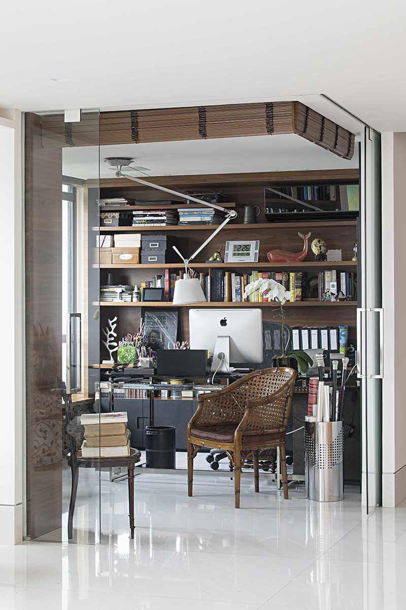 Logo na entrada, avista-se o escritório da moradora. Prateleiras em madeira, que nós projetamos, recebem o acervo de livros.