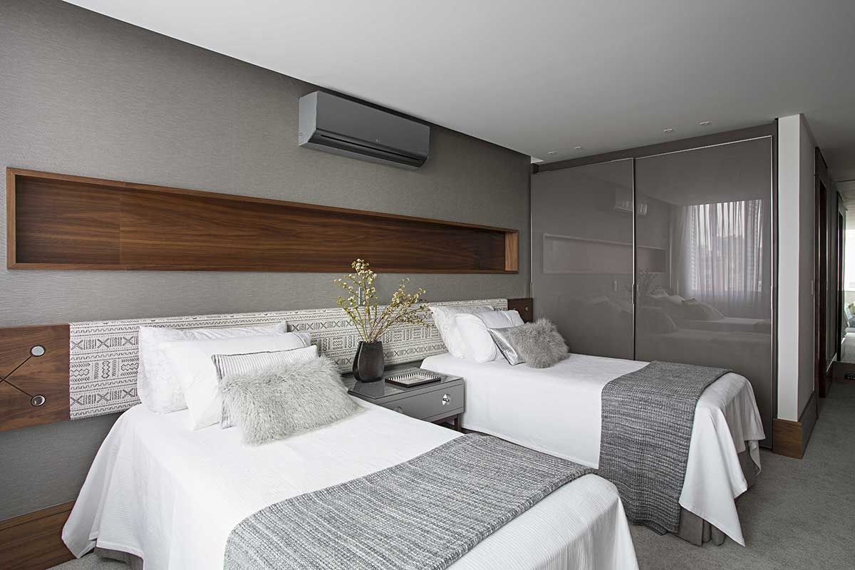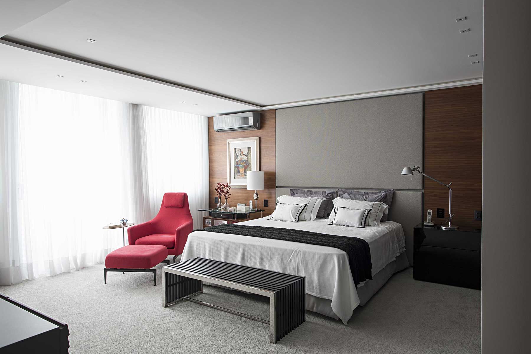 No quarto, marcenaria desenhada por Korman, mesa lateral Dpot, Carpete Santa Mônica, cortinas e revestimentos da cabeceira e poltrona: Tapeçaria Daniel Coutinho.