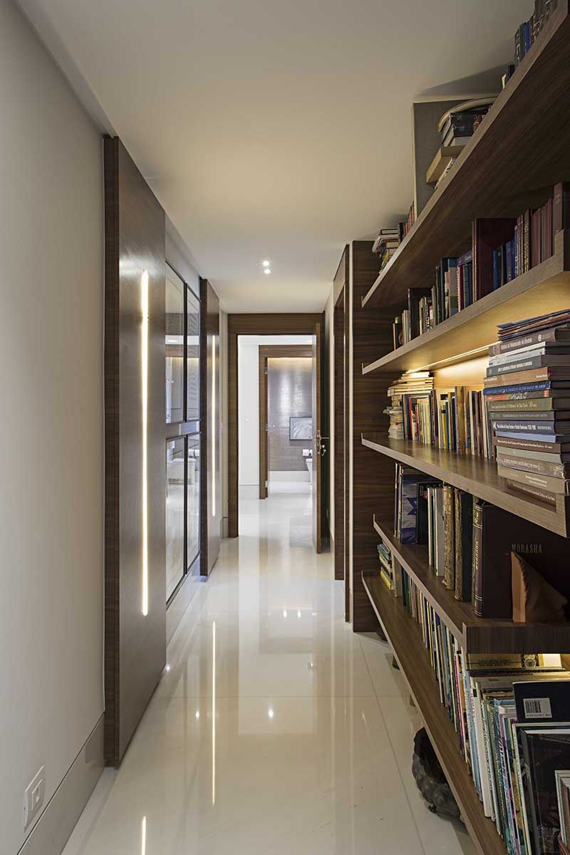Logo na entrada, avista-se o escritório da moradora. Prateleiras em madeira, que nós projetamos, recebem o acervo de livros.