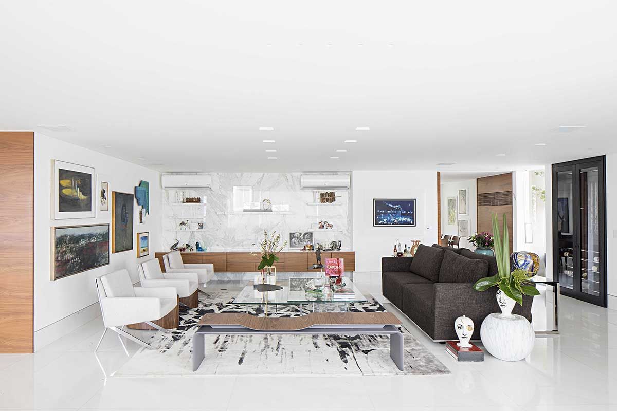A obra, que durou 1 ano, resultou em um décor atemporal com móveis e peças de cores mais escuras que fazem contraponto. Na sala de estar, a estante desenhada pela Korman Arquitetos em mármore, com um efeito diferente, pois fugiu da tradicional madeira.
