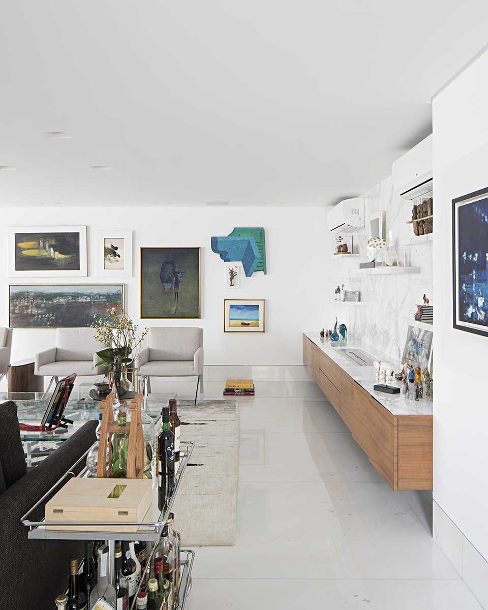 Ainda na sala, a televisão ficou ‘escondida’ em um armário de madeira. Quando não está sendo utilizada, a porta de correr, na cor branca, ganha destaque com o quadro.