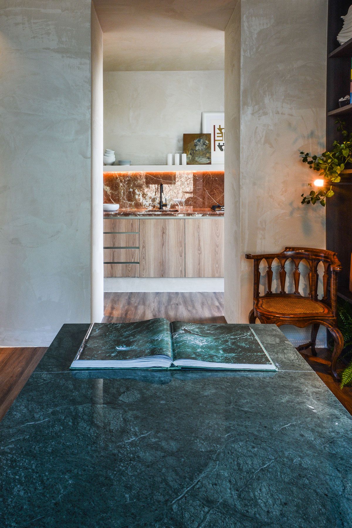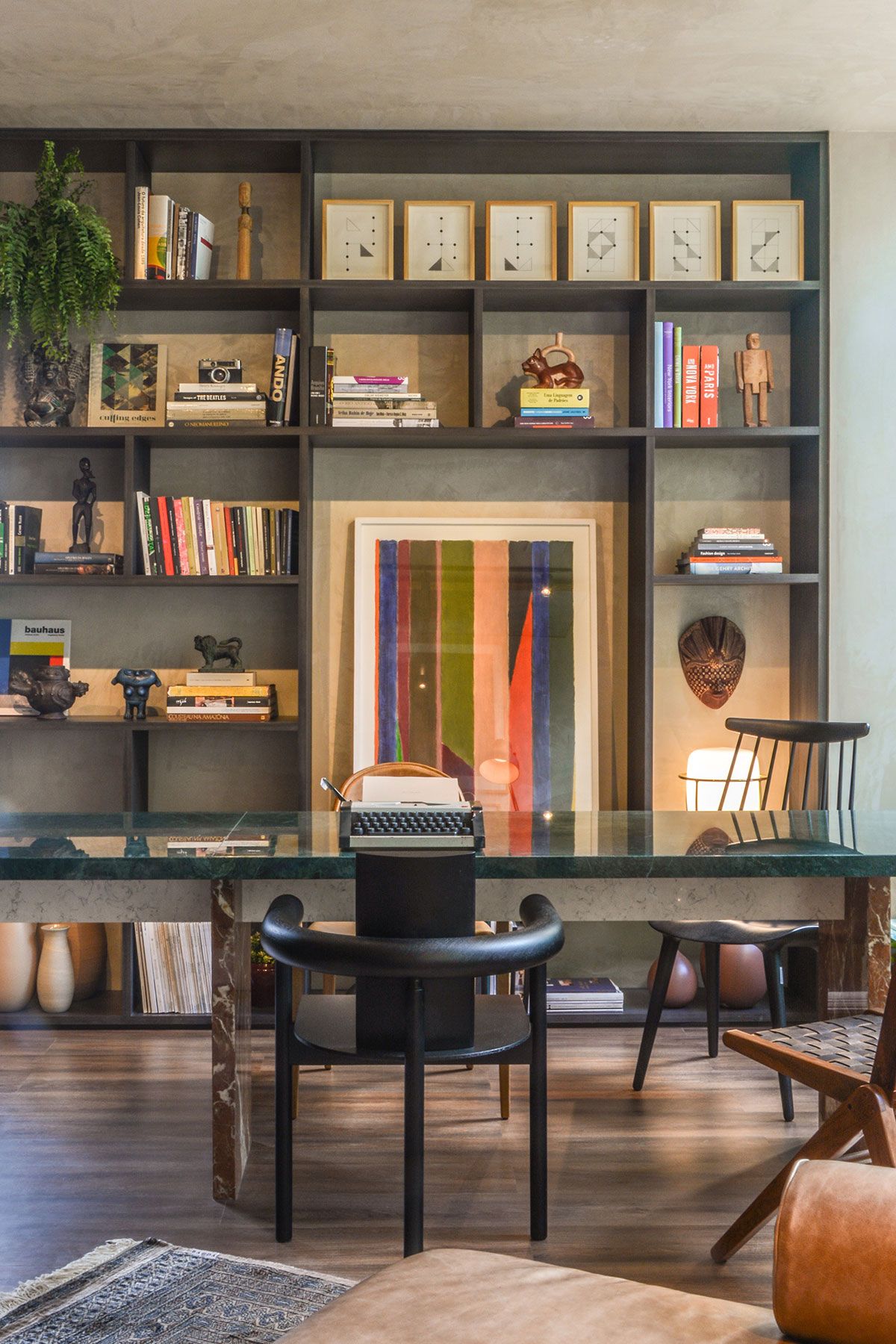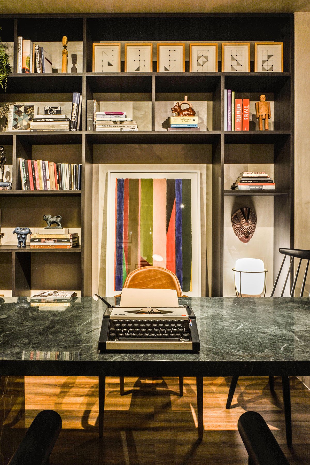 Fazem parte ainda do conjunto exposto no loft, objetos de decoração de lojas parceiras, livros e objetos garimpados em feiras e viagens. Outro desafio foi manter o equilíbrio em um ambiente repleto de relíquias e itens com valor afetivo, além de conciliar peças de design icônicos de Lina Bo Bardi e Carlos Motta, com peças contemporâneas assinadas por nomes como Guilherme Torres, Jader Almeida e Giacomo Tomazzi.