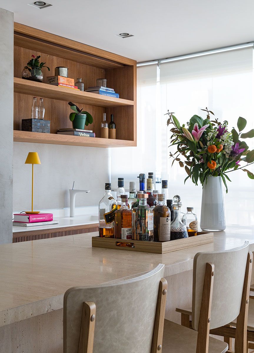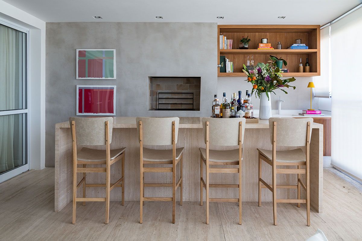 E pediram que fosse criada uma varanda gourmet, para reunir os amigos. Além de integrar a cozinha e o living e unir os dois quartos, transformando-os em uma suíte master com closet.