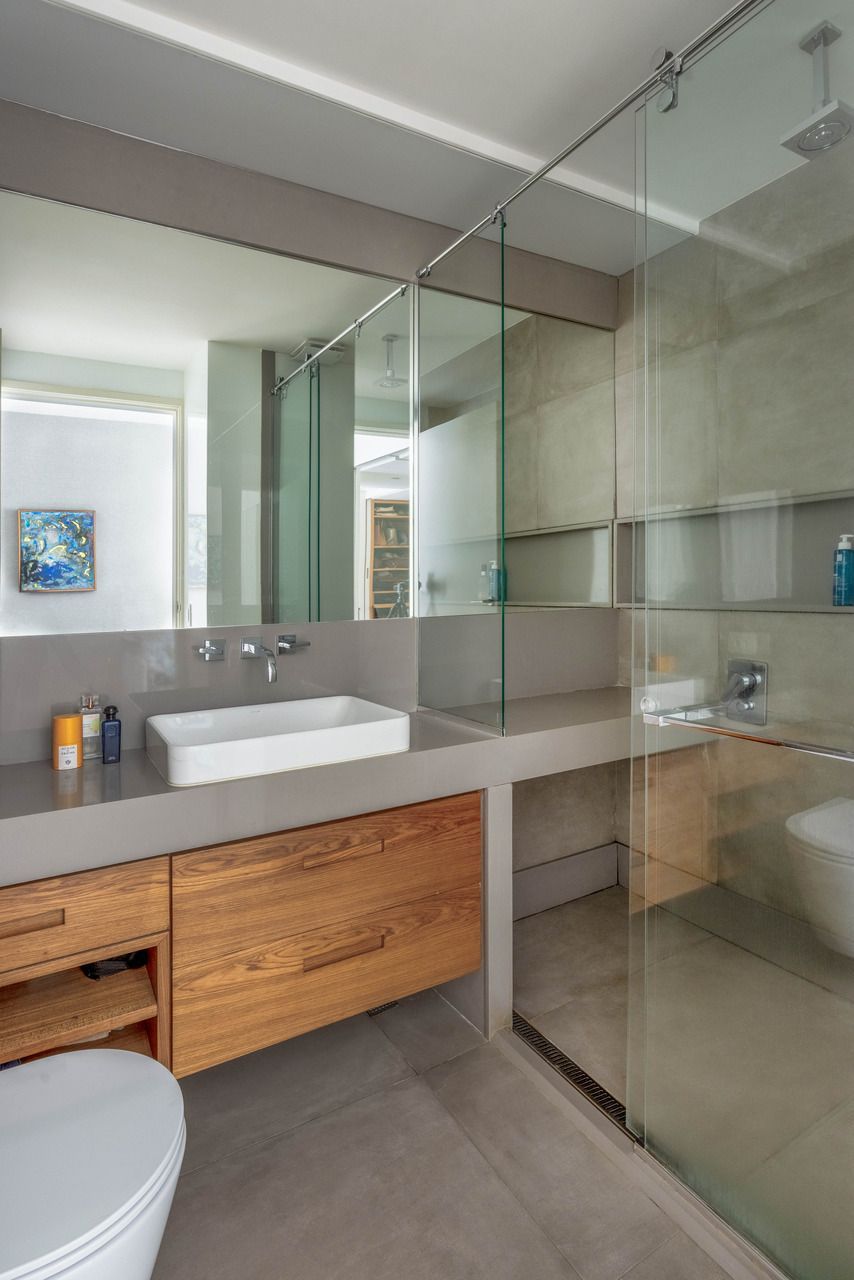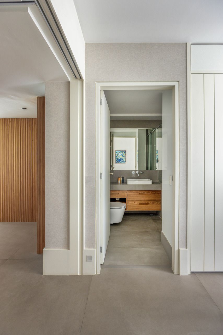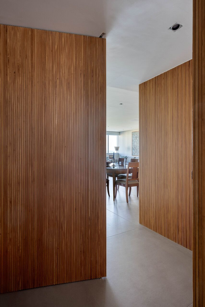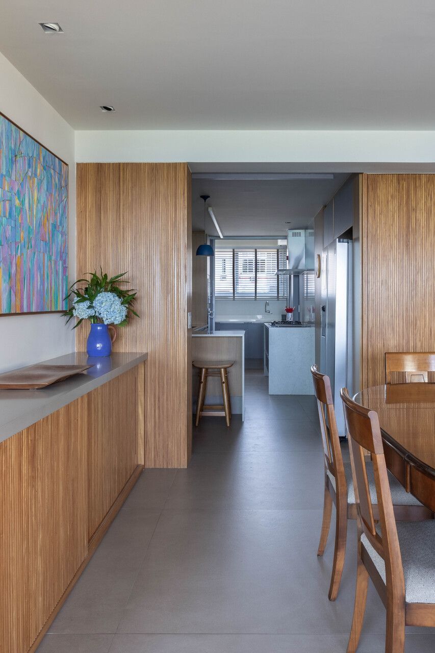 A primeira medida foi ampliar todas as portas e vãos que passaram a ter 90 cm. Os banheiros ganharam atenção especial com boxes e pias que permitem a retirada fácil do vidro e dos armários. Tudo para facilitar o uso futuro de cadeiras de rodas, caso seja necessário. O piso cimentício é o mesmo em todo o apartamento. A área de serviço foi pensada para ser prática e funcional. E a cozinha é separada da sala de jantar por uma porta de correr que, quando aberta, permite muita entrada de ventilação e iluminação naturais.