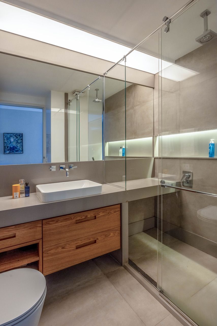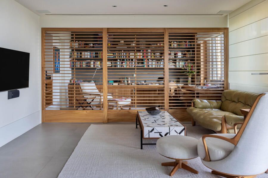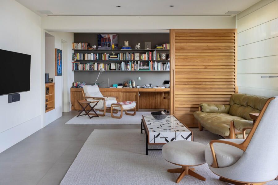 O apartamento ganhou ainda um home-office integrado à área social por venezianas de correr, já que hoje tanto ela como o marido seguem ativos e trabalhando muito. Mas, no futuro, o espaço pode ganhar outros usos, sem a necessidade de obras. A compra e reforma do imóvel também significou outra grande mudança na vida do casal. Antes, eles moravam separados em residências muito maiores: ela em uma casa de três andares cheia de escadas no alto de uma ladeira; ele, em um amplo apartamento de 350 m² nada acessível.
