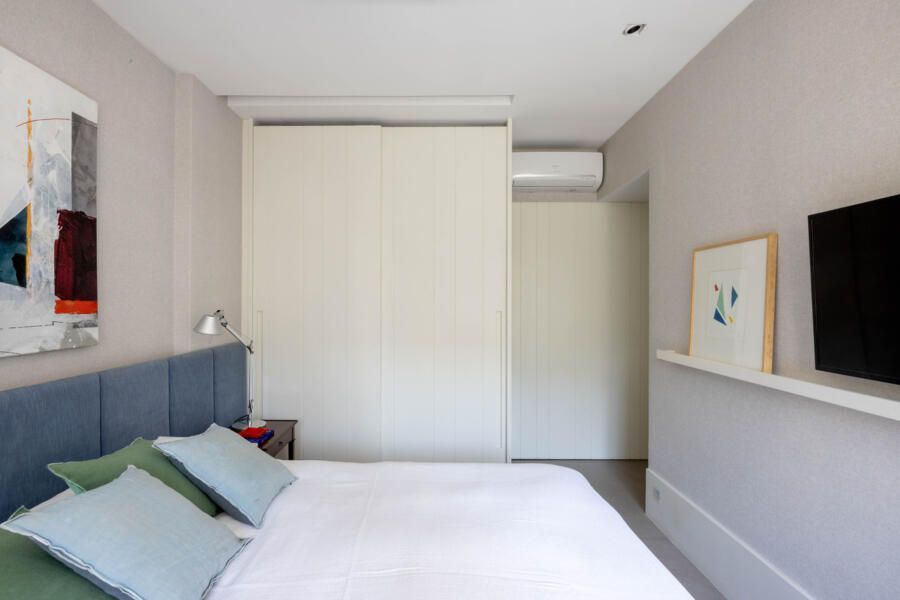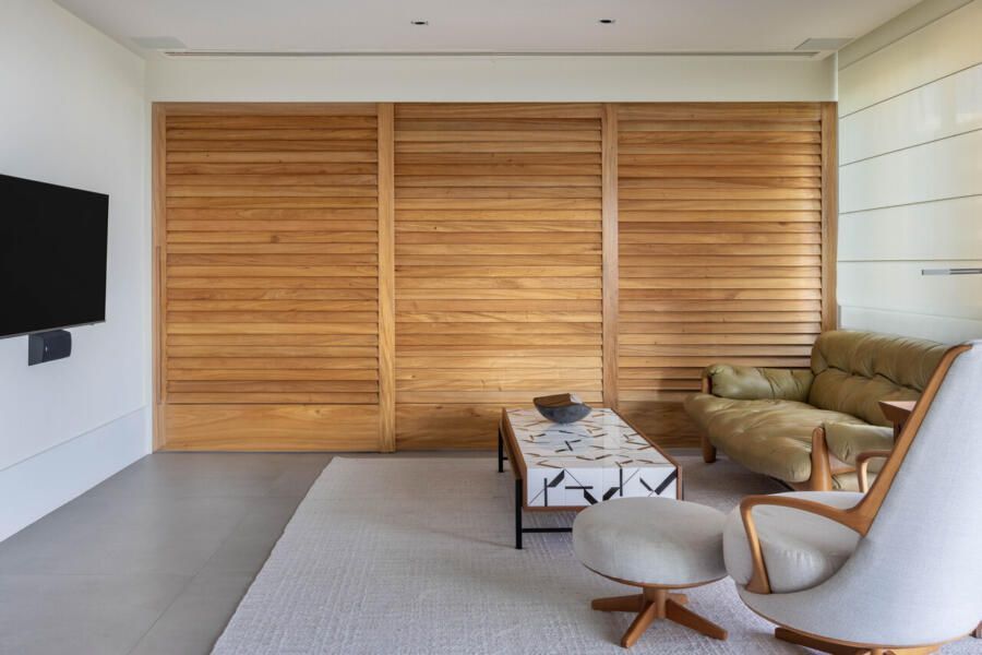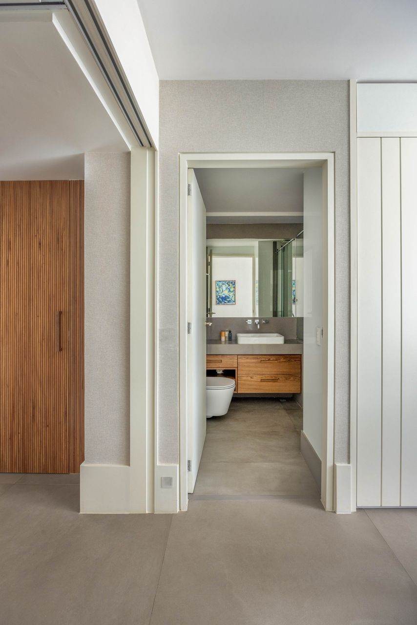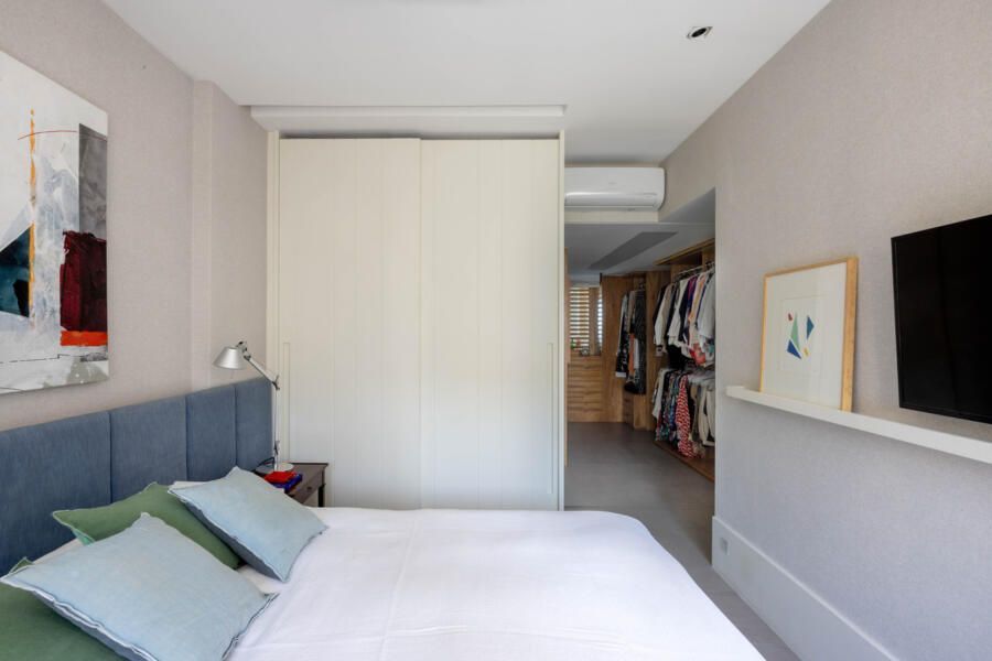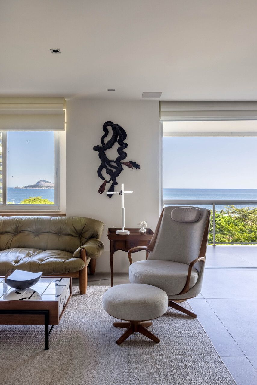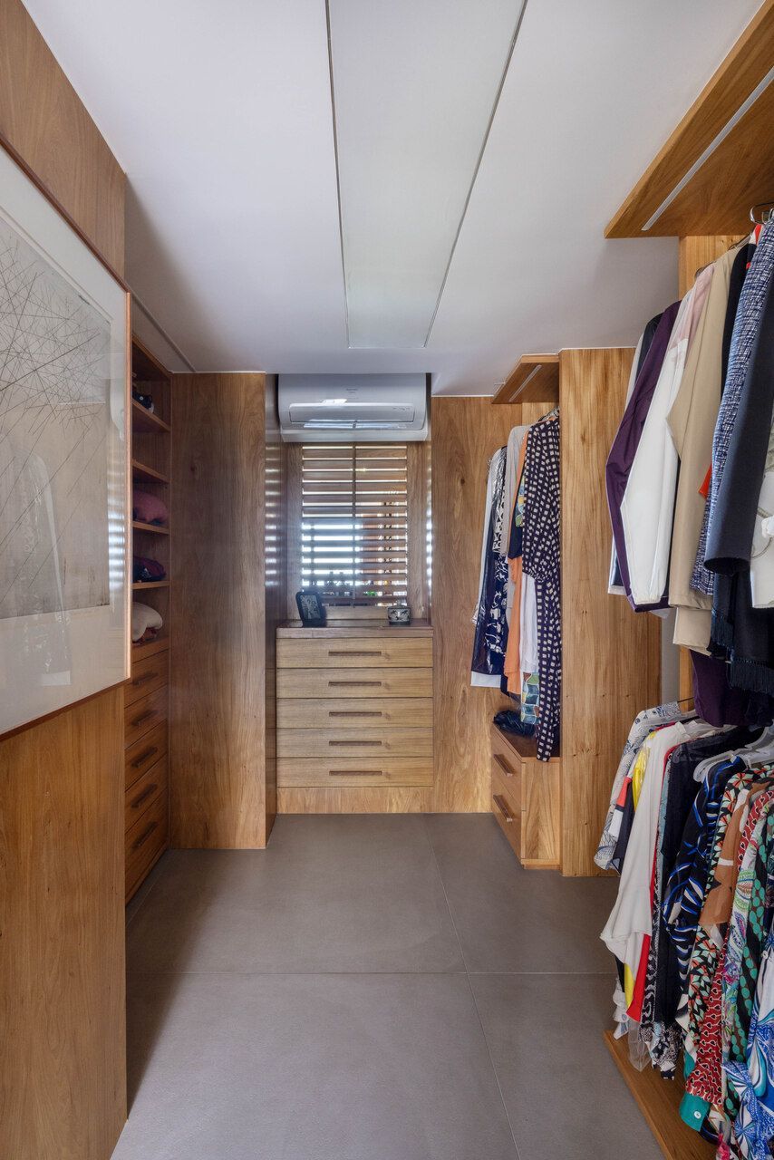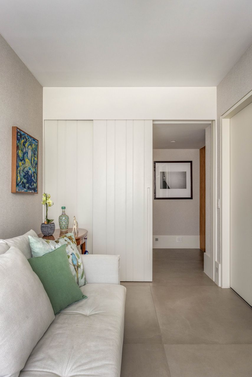 Outra mudança importante foi na configuração da área íntima. Os quatro quartos originais foram transformados em duas suítes separadas por uma porta de correr. Hoje, o espaço funciona como um único quarto com closet e brise por onde se avista a praia, sala íntima, banheiros independentes para ele e para ela e uma bela vista para o mar. Mas, quando a filha que mora fora vem visitar, a porta se fecha, e o uso pode ser adaptado. No futuro, inclusive, a segunda suíte poderá também ser ocupada por cuidadores, se houver necessidade.