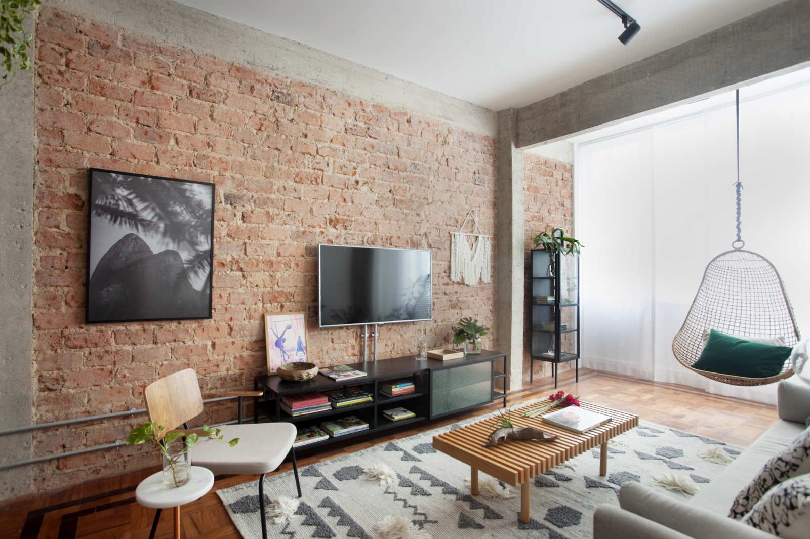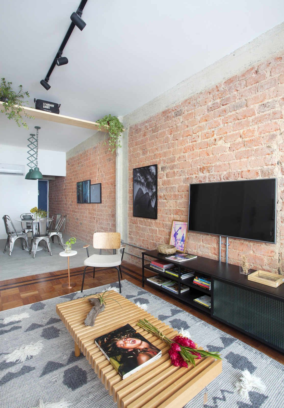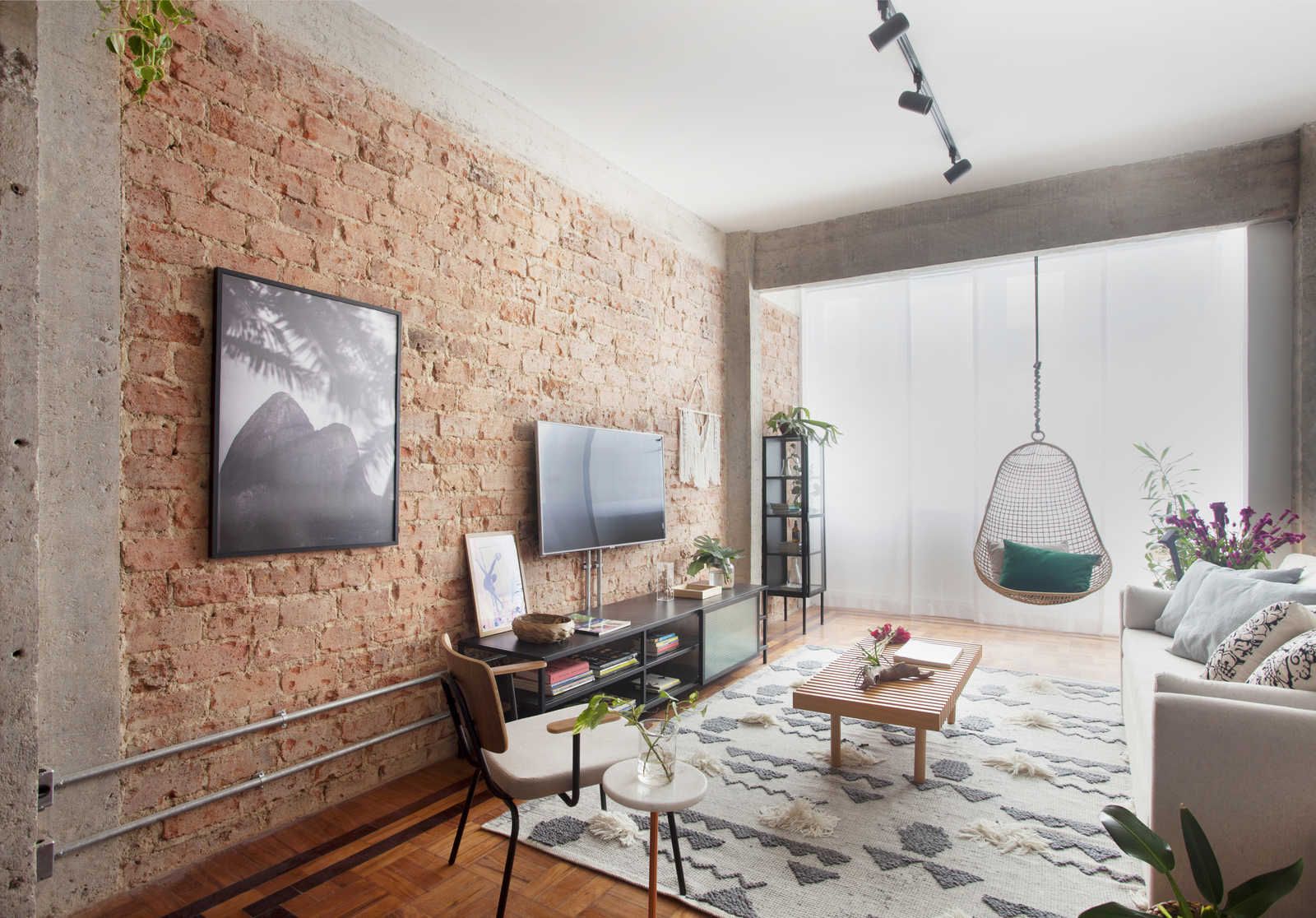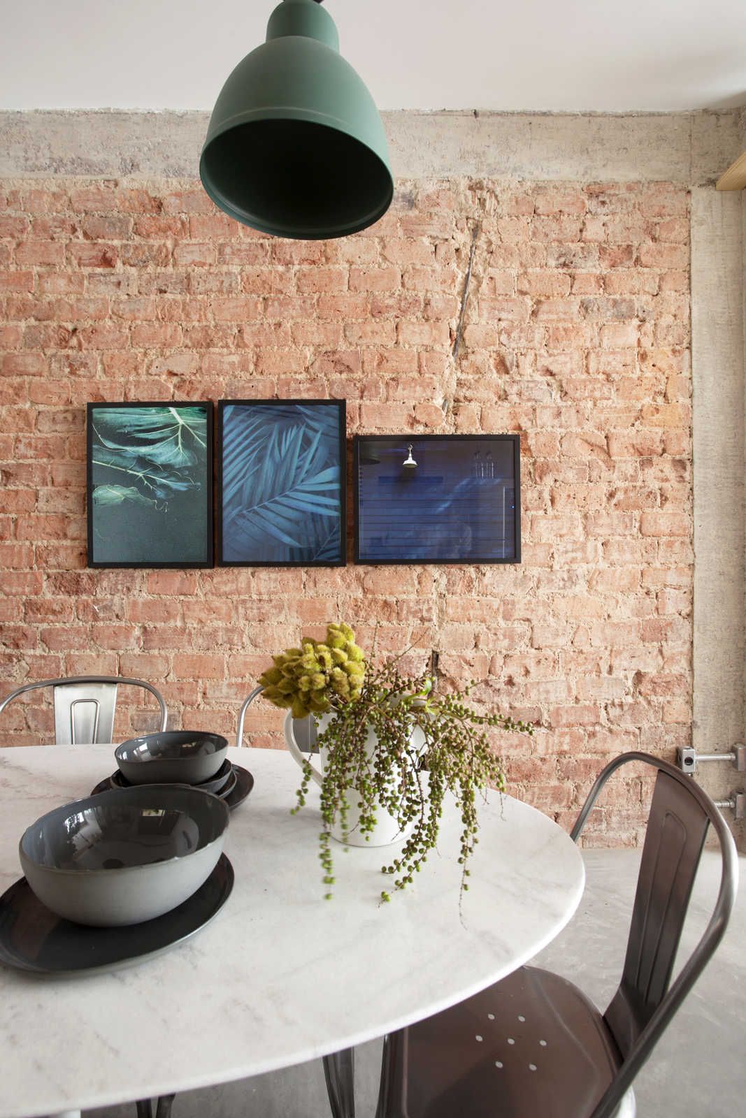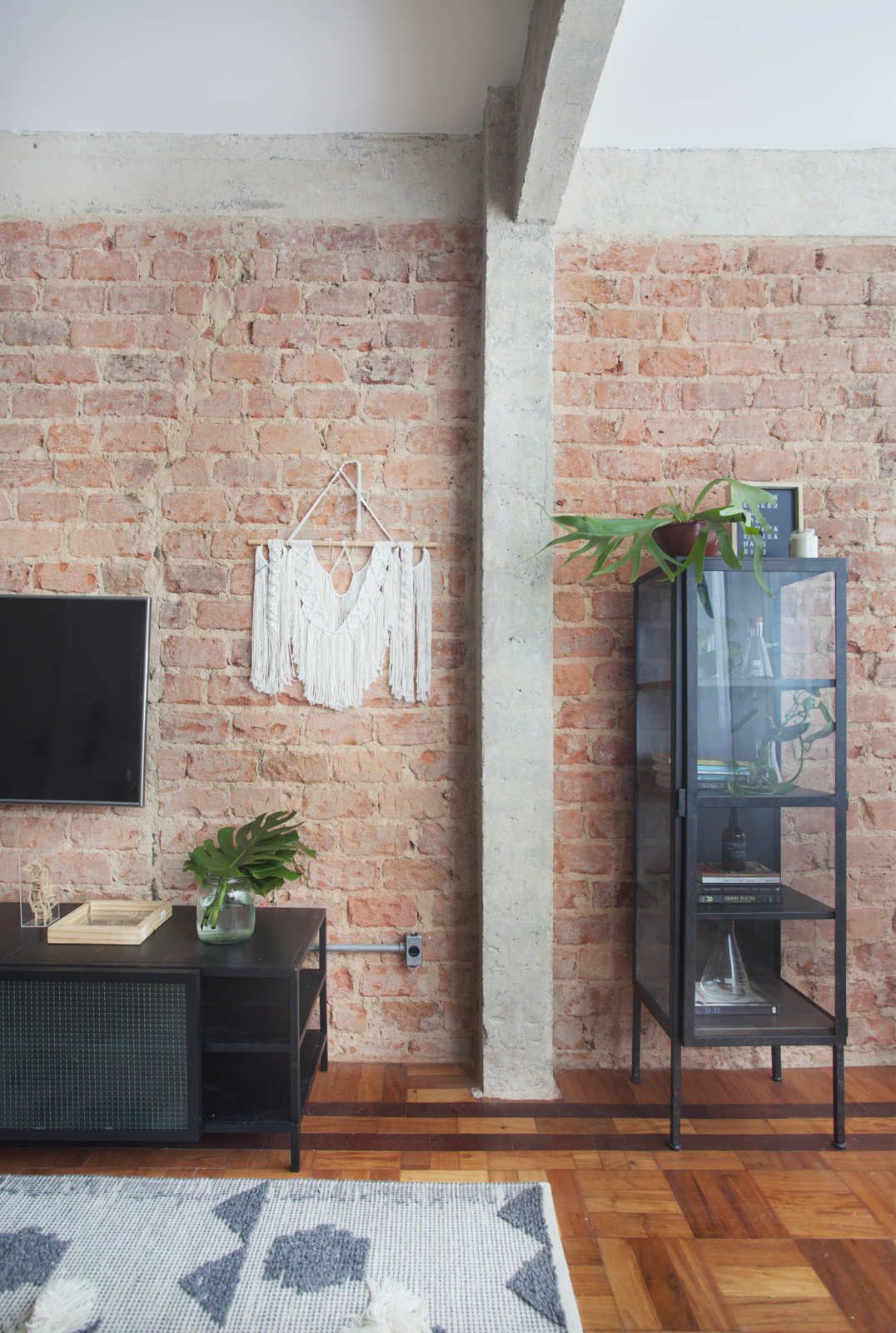 “O maior desafio foi integrar e propor a melhor solução para deixar a luz entrar e proporcionar uma boa circulação para os ambientes. Inverti cômodos de lugar trazendo luz para dentro dos espaços e descasquei parte das paredes, deixando à mostra tijolinhos maciços e a estrutura de concreto existente.”