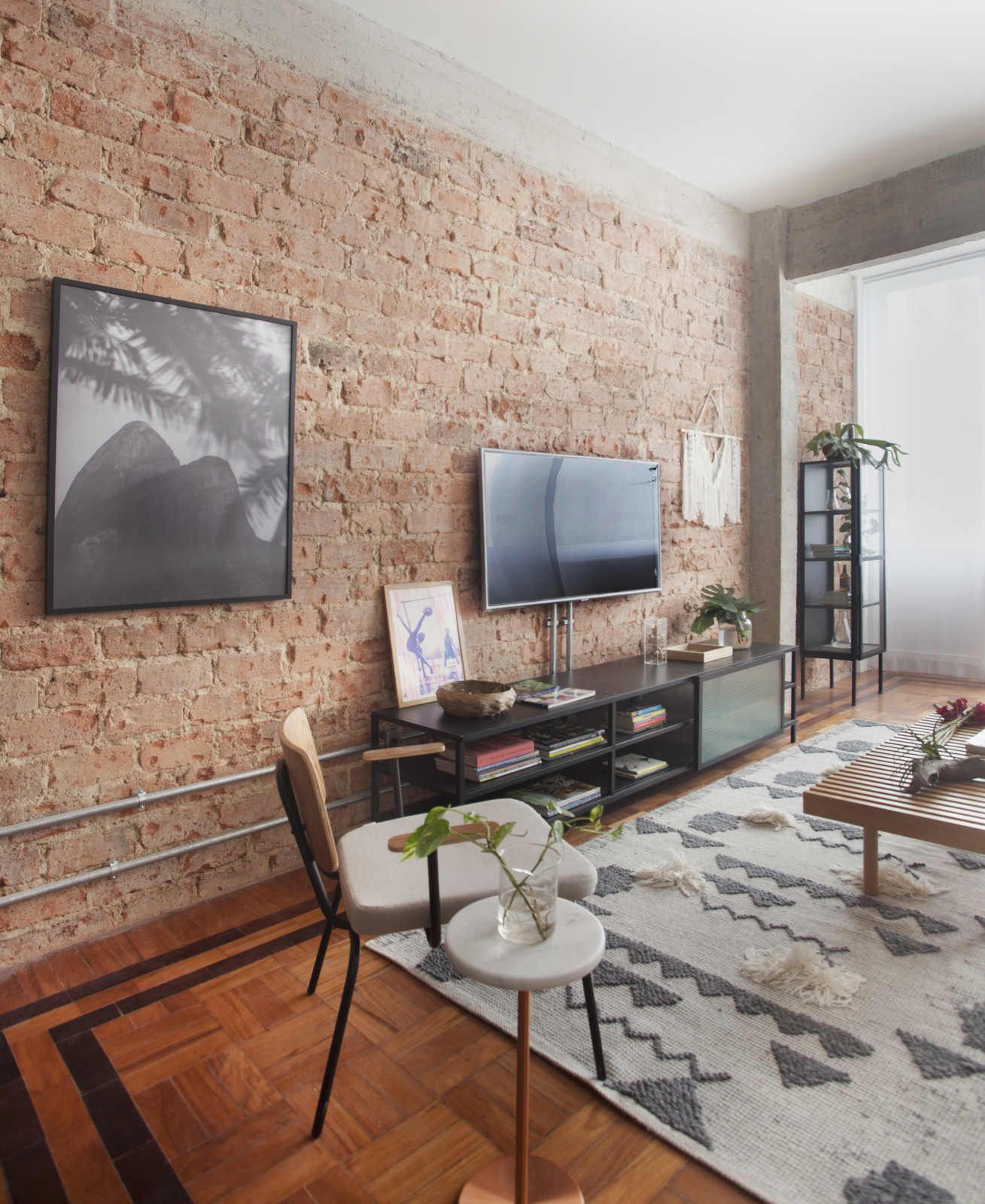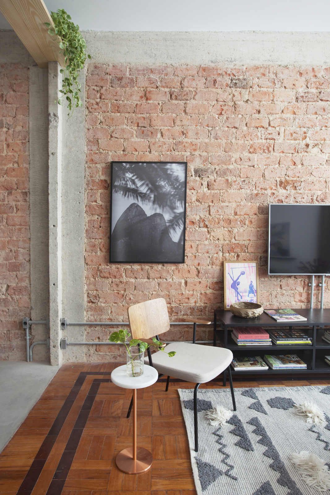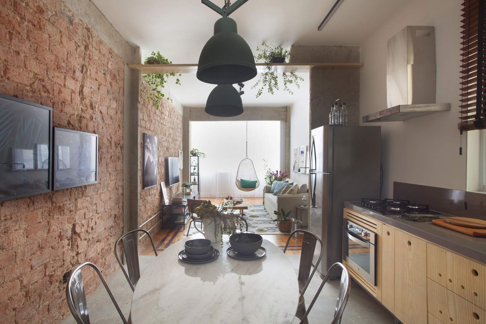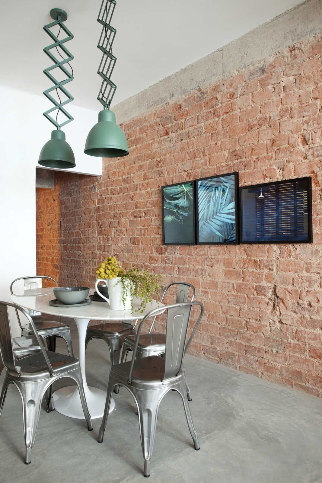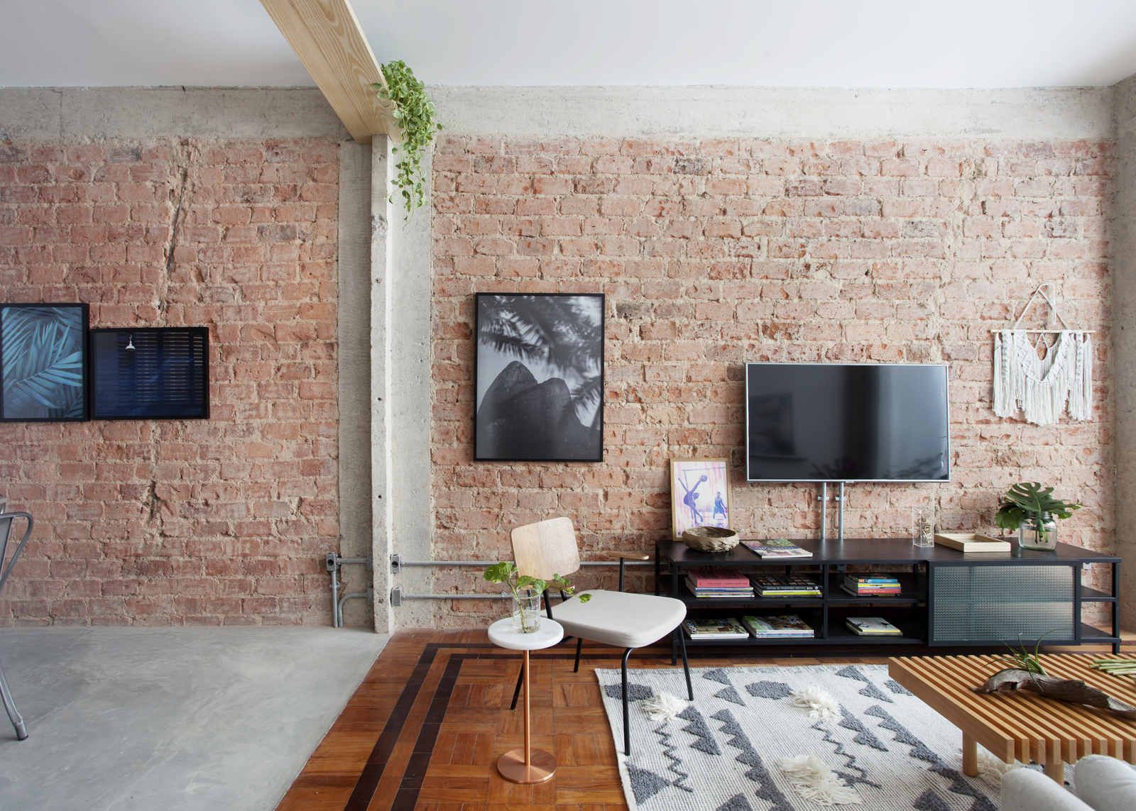“O maior desafio foi integrar e propor a melhor solução para deixar a luz entrar e proporcionar uma boa circulação para os ambientes. Inverti cômodos de lugar trazendo luz para dentro dos espaços e descasquei parte das paredes, deixando à mostra tijolinhos maciços e a estrutura de concreto existente.”