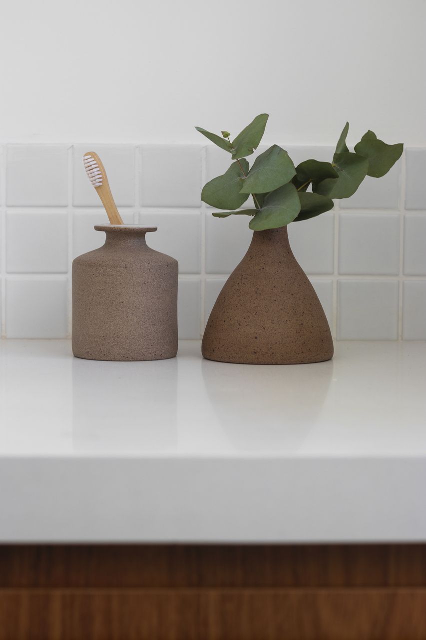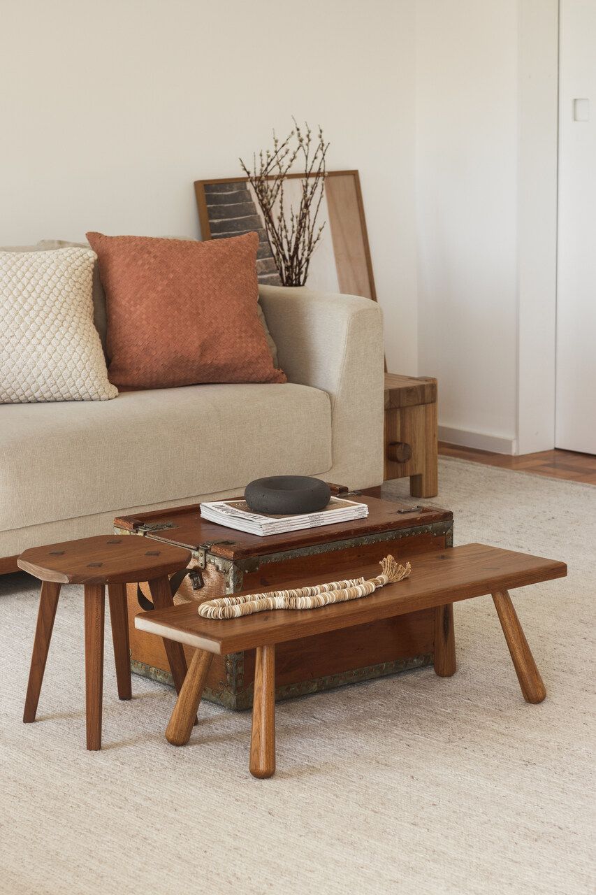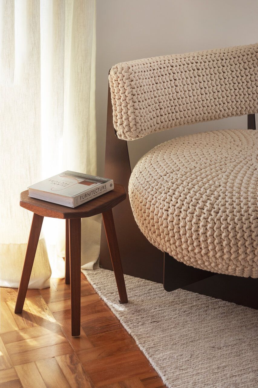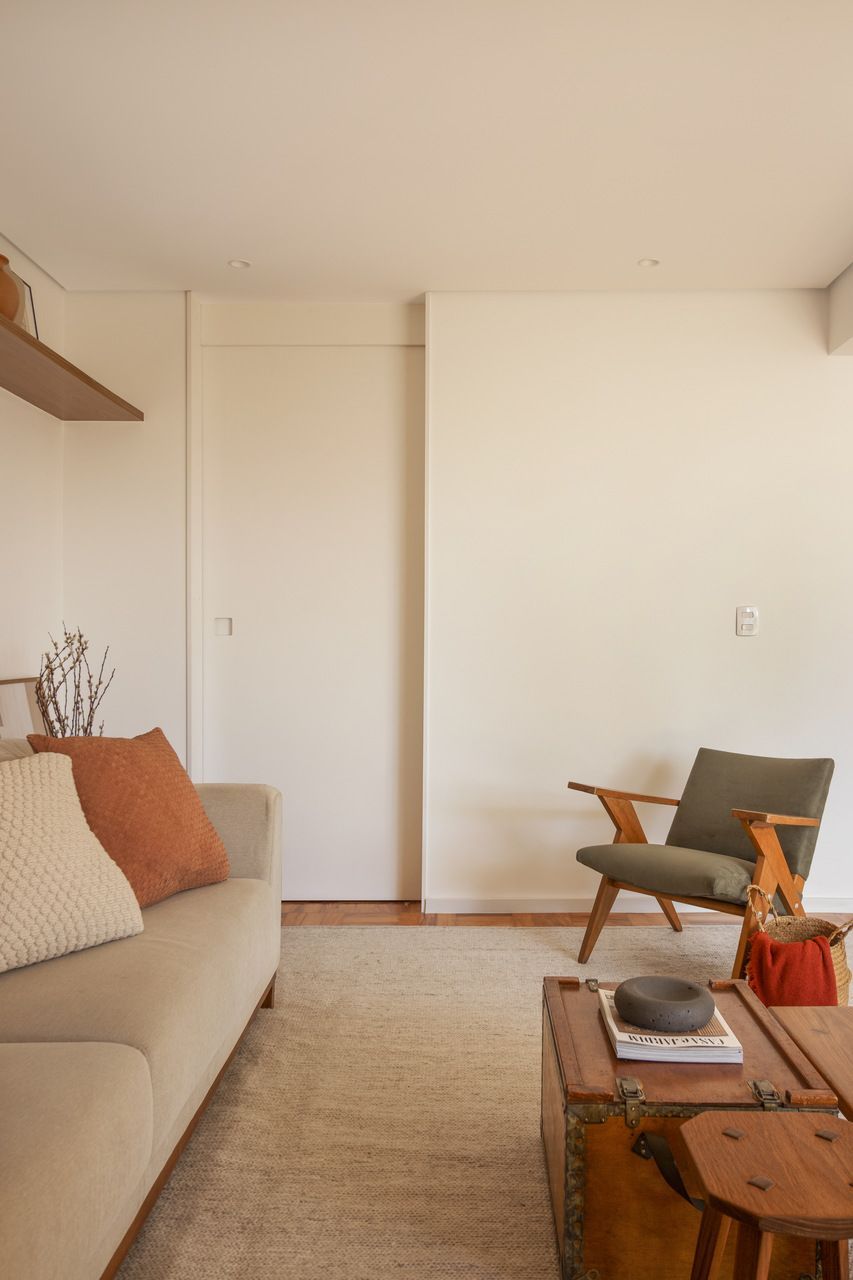 Para a decoração, o escritório escolheu peças de design brasileiro que dialogam com o espírito do projeto: o banco Jake de Fernando Mendes, a poltrona Zanine N de Zanine Caldas e a poltrona Terra do Estúdio Pedro Luna. Tapetes claros, sofá neutro e uma paleta terrosa em detalhes garantem identidade sem impor limites aos futuros moradores. O resultado se provou certeiro já nos primeiros dias, como comenta o morador: