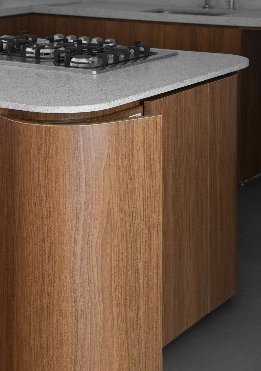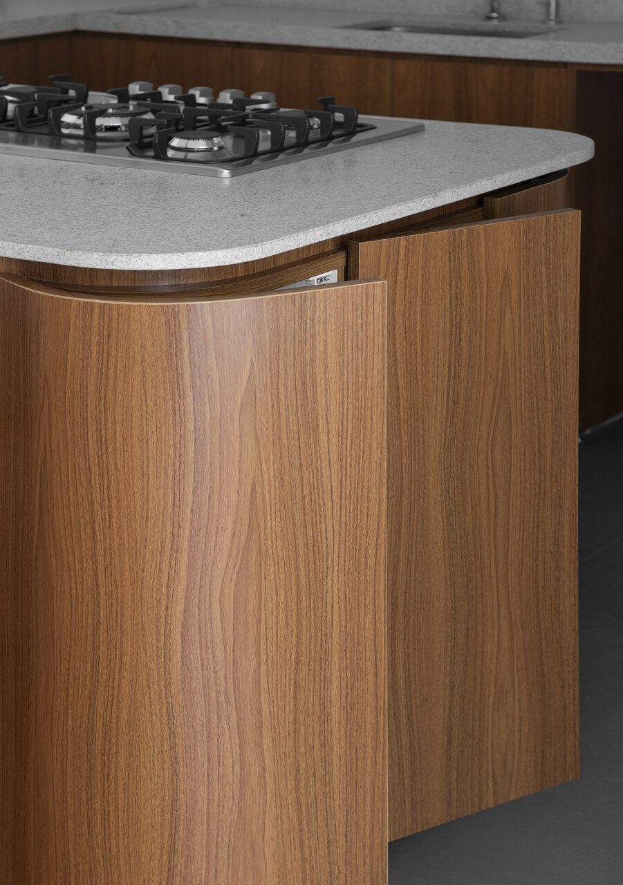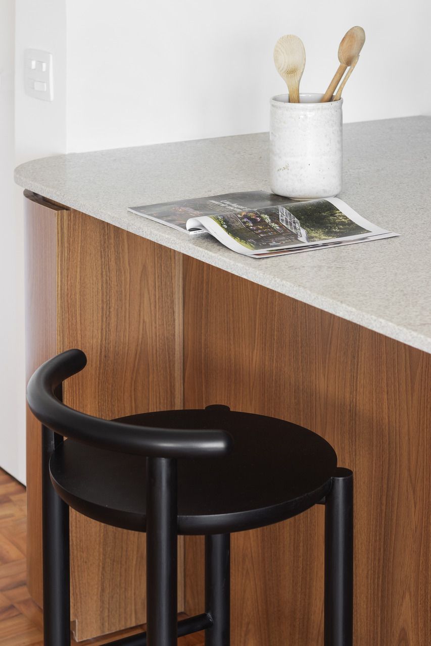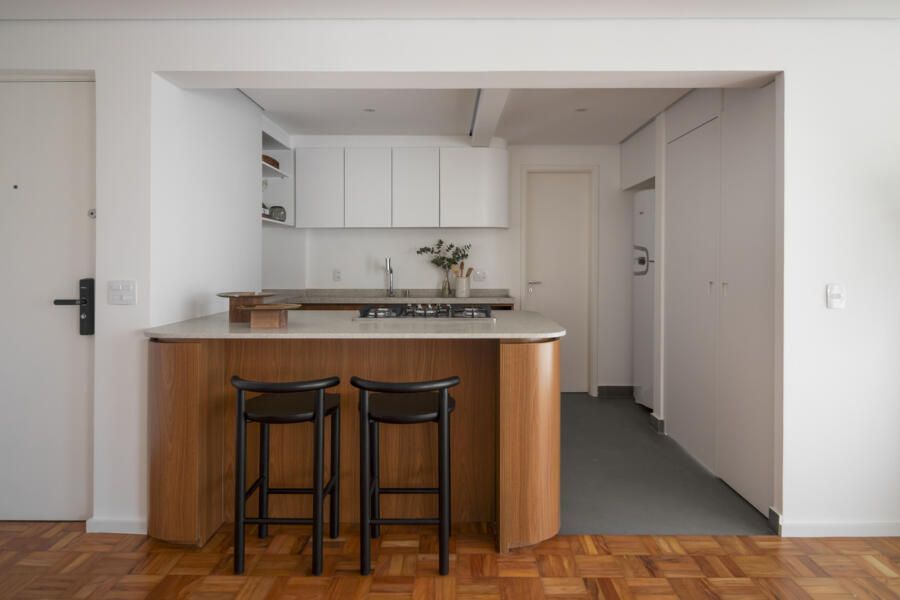A grande solução foi abrir a cozinha e um dos quartos para a área social, criando um espaço contínuo, luminoso e convidativo. A ilha, cuidadosamente posicionada, estabelece a transição natural entre preparo, convivência e refeições rápidas, fortalecendo a fluidez que guia toda a planta. Essa integração ganhou ainda mais força com a paleta clara, uma base que acolhe diferentes estilos de decoração ao longo do tempo.