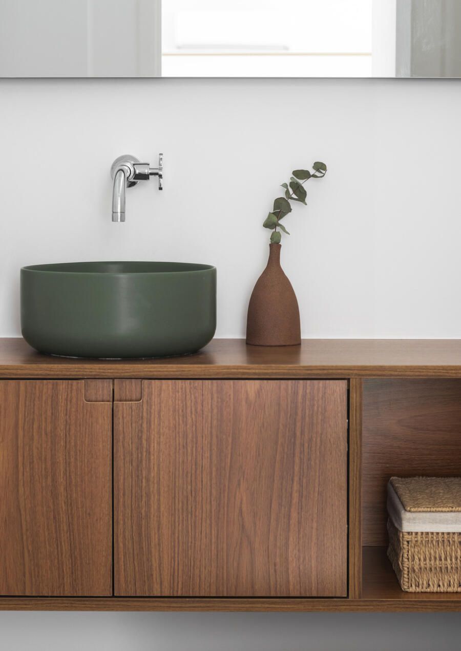 Entre os desafios da obra, estava o equilíbrio entre personalidade e adaptabilidade. Para isso, a equipe apostou na combinação entre materiais clássicos e detalhes pontuais de cores. O piso verde da cozinha introduz uma cor marcante e inesperada, enquanto o taco restaurado nas áreas de estar e dormitório aquece os ambientes sem impor uma estética rígida. Já nas áreas molhadas, o porcelanato garante durabilidade sem comprometer a leveza geral.