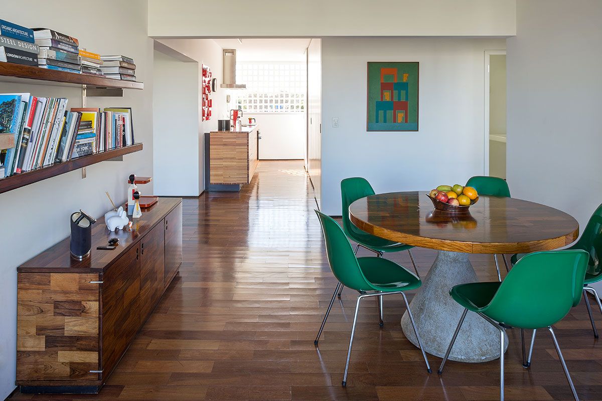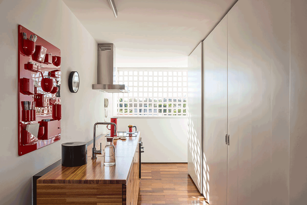 A cozinha se adequa com o estar e o armário ganhou prateleiras em gradil metálico, inspiradas nos cobogós. O mobiliário e as obras de arte resgatam características brasileiras de alguns mestres: Burle Marx, Dionisio del Santos, Zanine Caldas, Lina Bo Bardi, Sergio Rodrigues, Zalszupin entre outros.