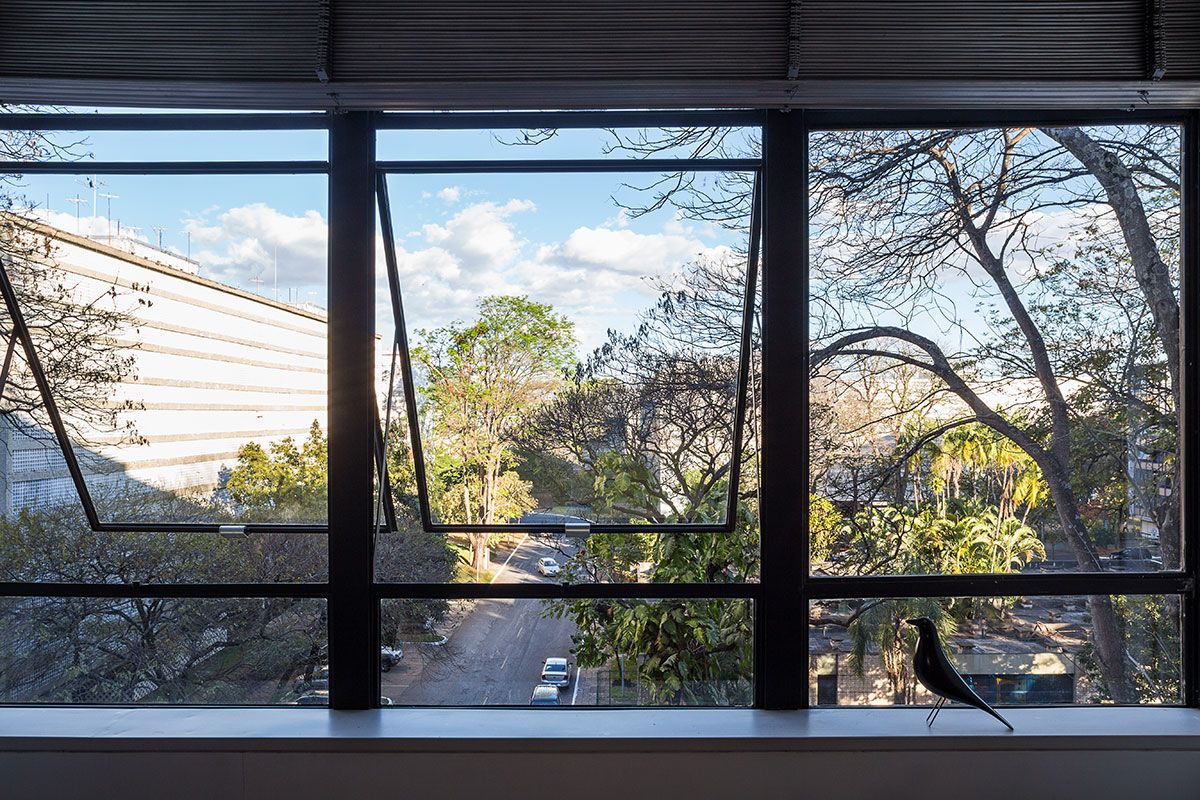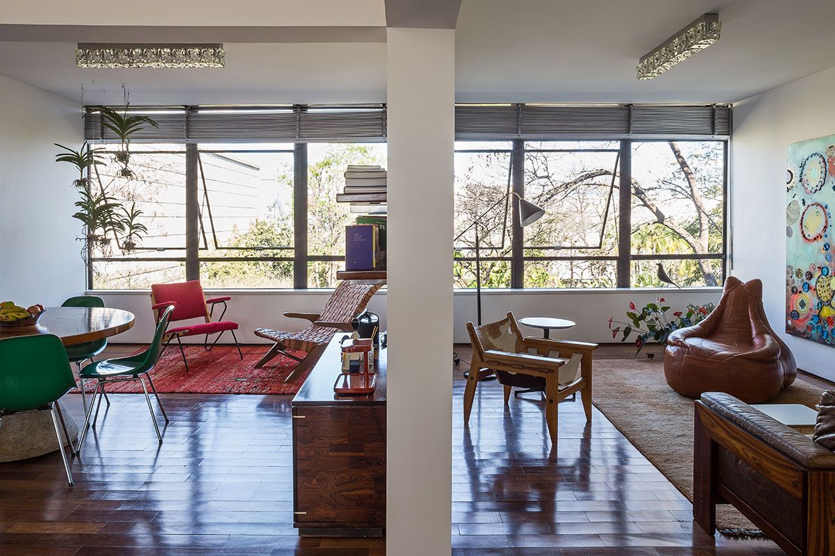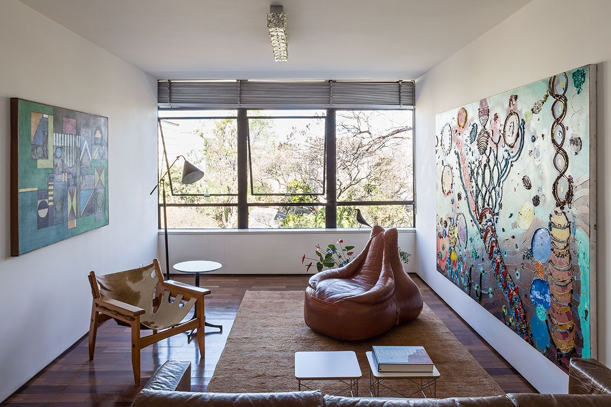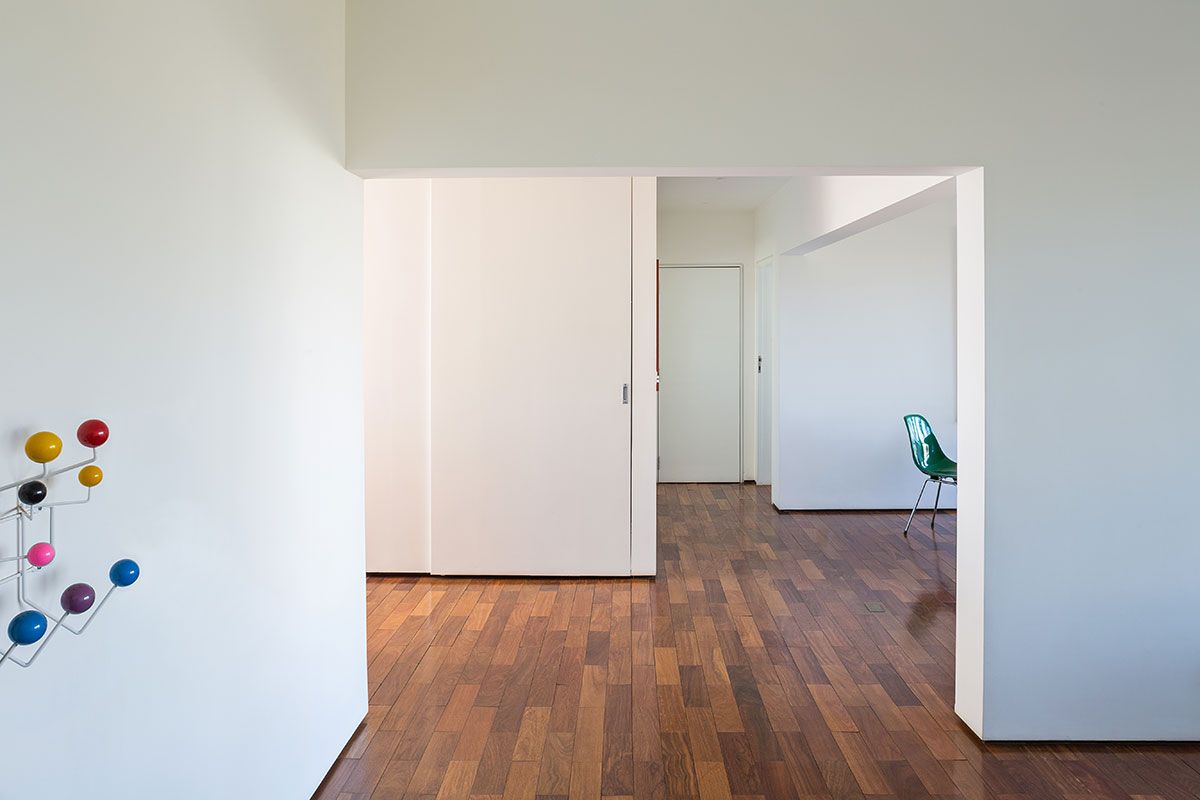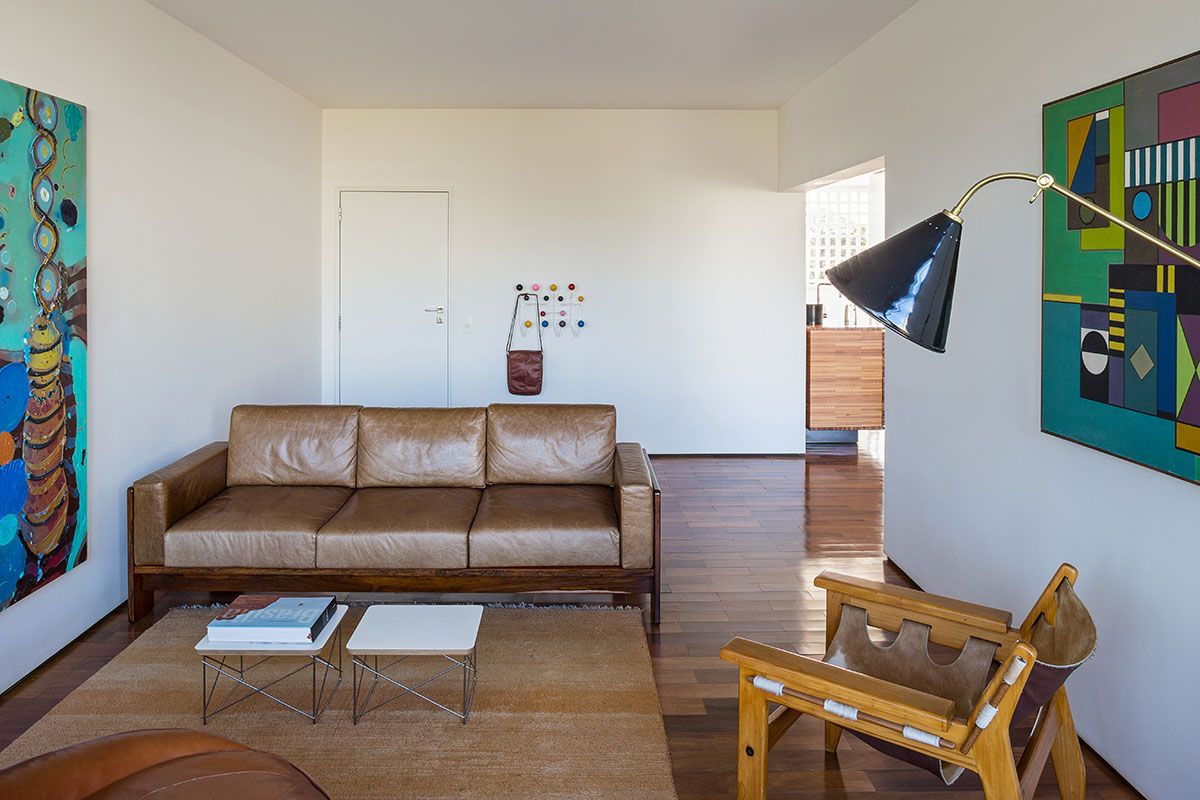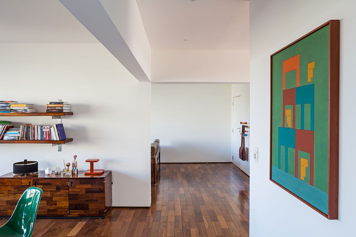 A intenção de resgatar o silêncio visual deixaria a paisagem, as obras de arte e o design em evidência. Por isso, o escritório refez o reboco com tinta branca e reposicionou os tacos de madeira com a mesma paginação original.
