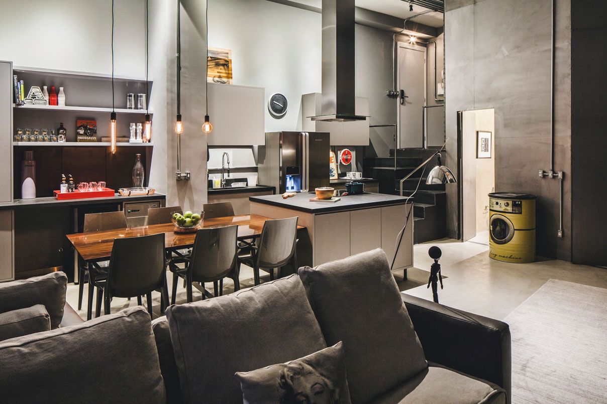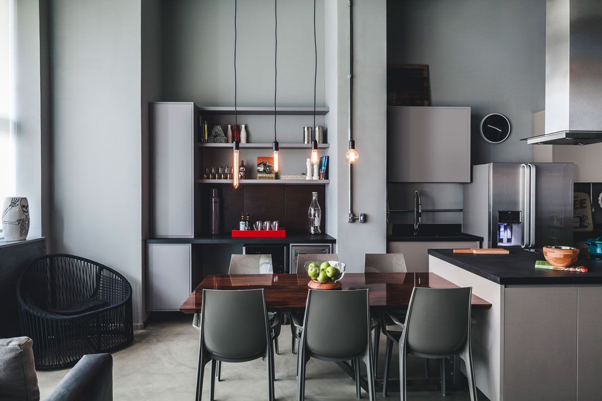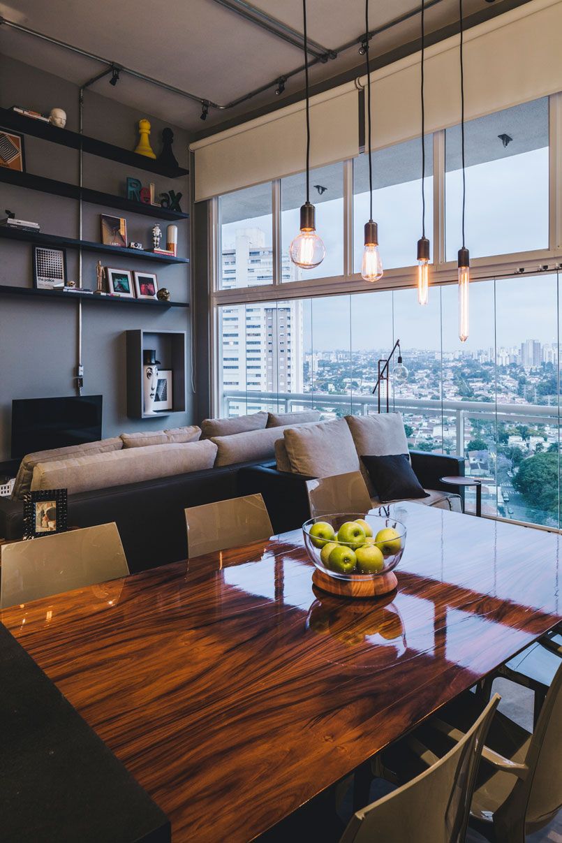 O cliente pediu ao Studio Tucah Campos algo industrial que remetesse a NY. O escritório deu ainda alguns toques para que ficasse aconchegante, misturando a madeira, por exemplo, na mesa da sala de jantar.