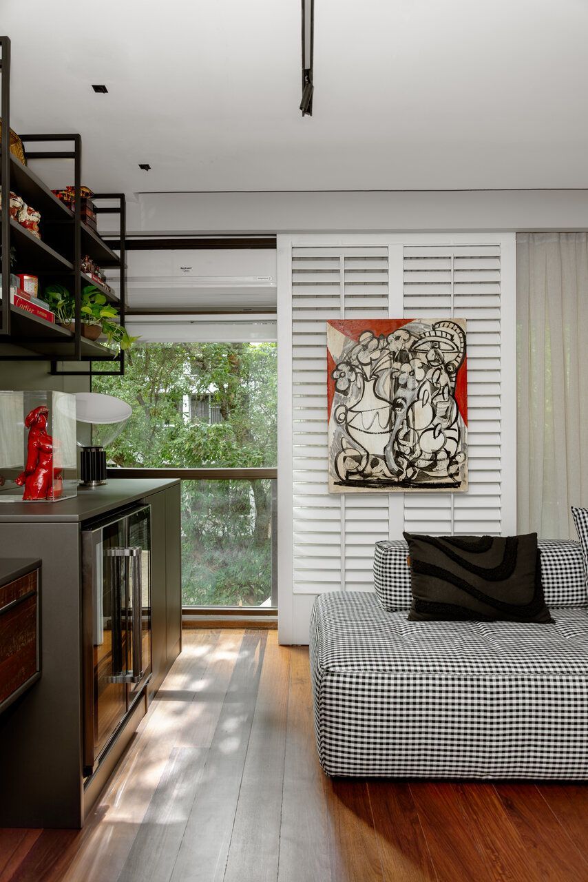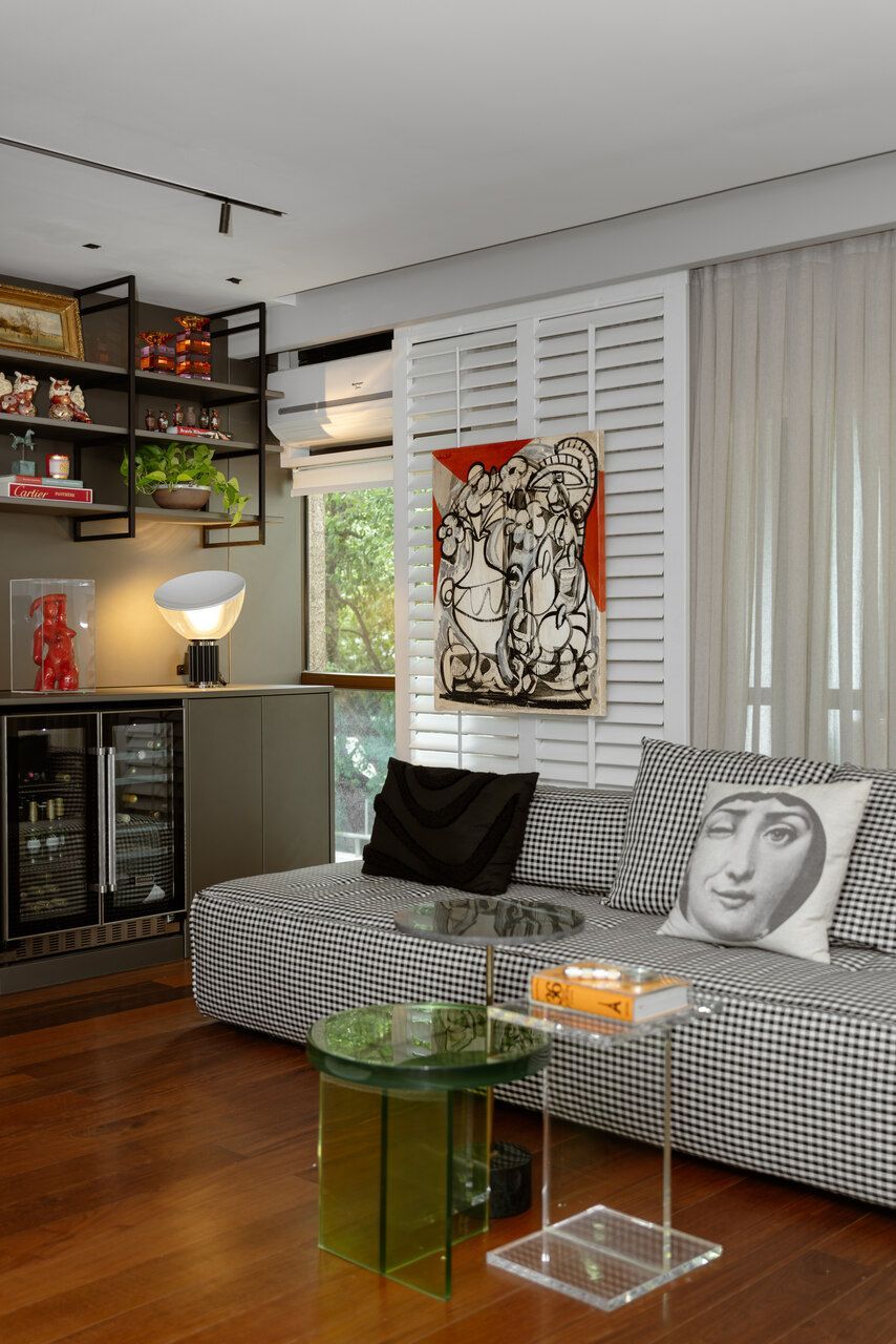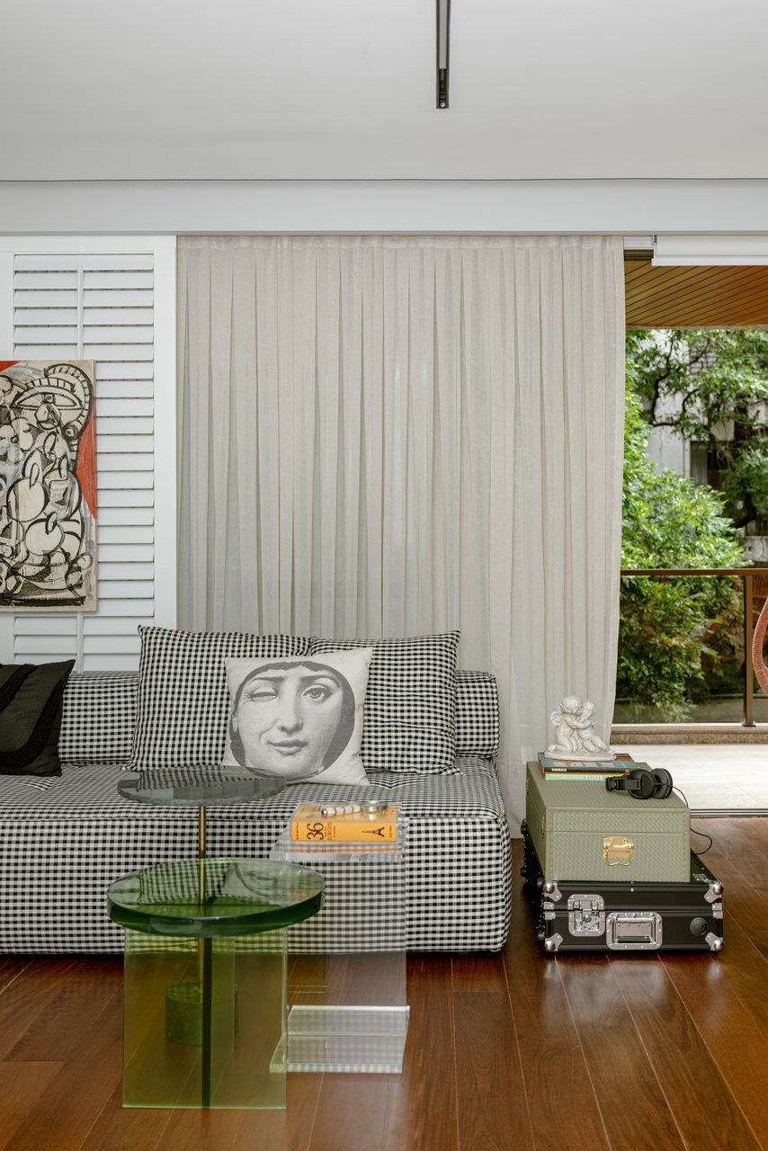 “O pedido central era que a casa respeitasse quem eles são. A família já possuía um mobiliário recente de um projeto nosso, além de um acervo de arte importante e uma forte relação afetiva com os objetos. O objetivo não era trocar tudo, mas reorganizar. Rever layout, circulação e usos, deixando a casa mais alinhada com o momento atual deles. Isso também incluiu intervenções mais ousadas, como o reestofamento do sofá em tecido xadrez e a poltrona Mole em verde.”