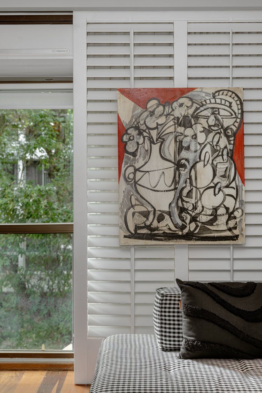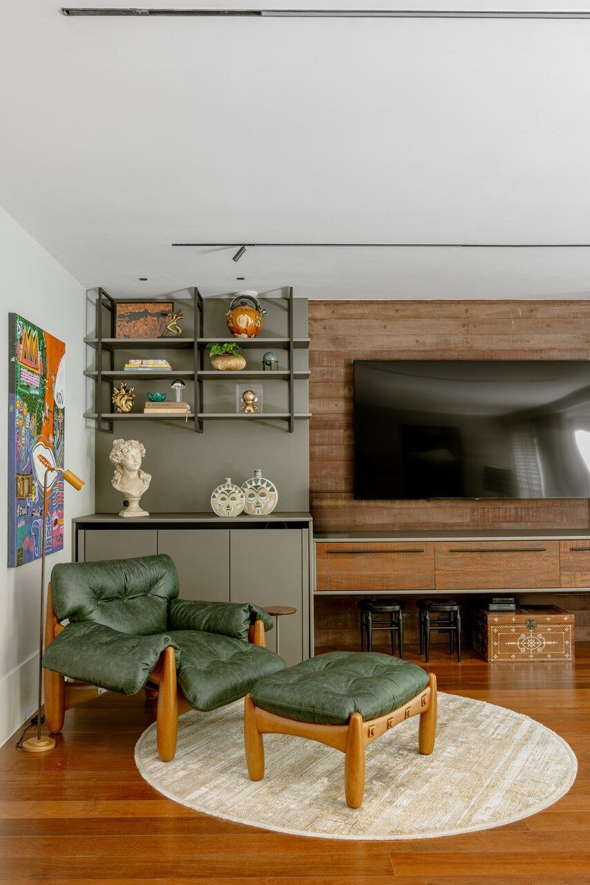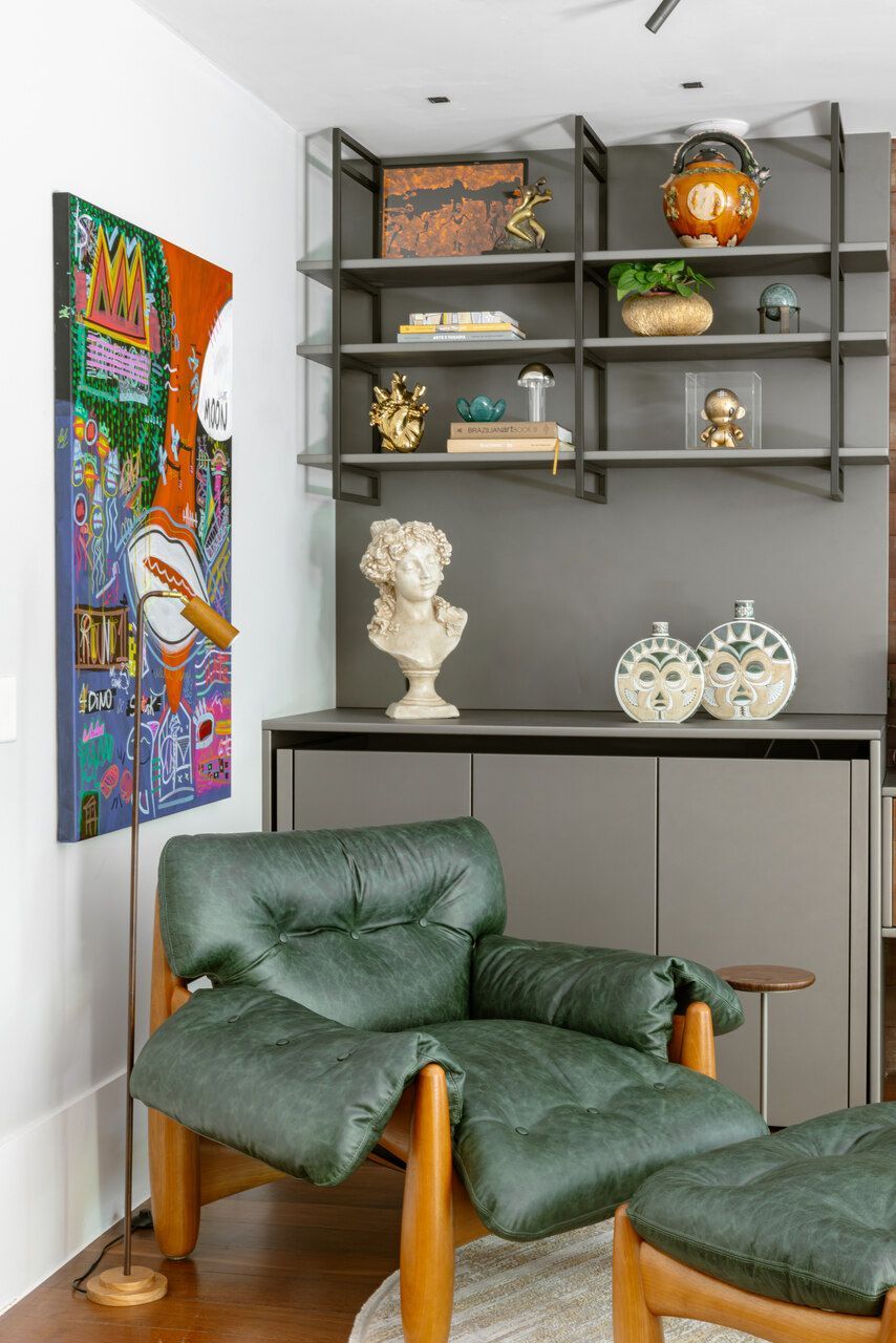 “O pedido central era que a casa respeitasse quem eles são. A família já possuía um mobiliário recente de um projeto nosso, além de um acervo de arte importante e uma forte relação afetiva com os objetos. O objetivo não era trocar tudo, mas reorganizar. Rever layout, circulação e usos, deixando a casa mais alinhada com o momento atual deles. Isso também incluiu intervenções mais ousadas, como o reestofamento do sofá em tecido xadrez e a poltrona Mole em verde.”