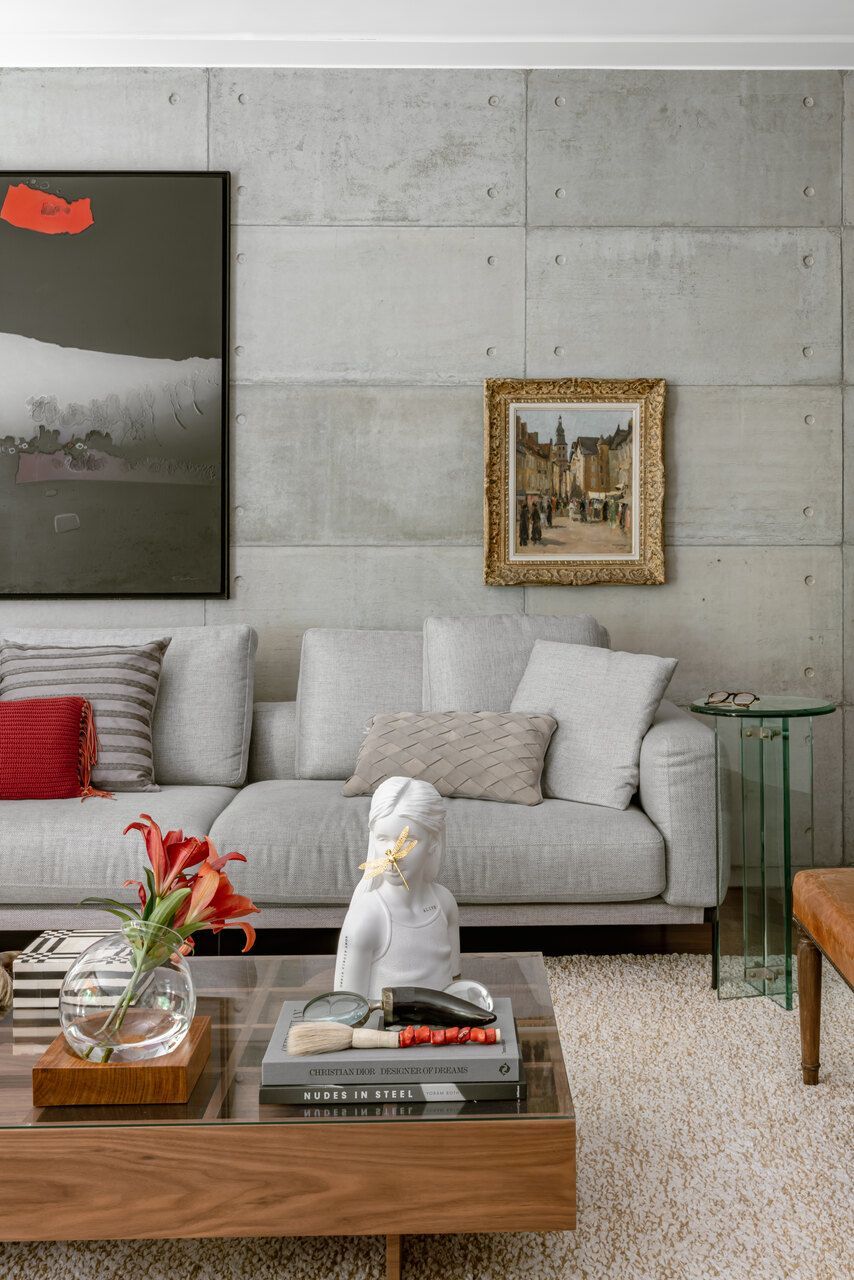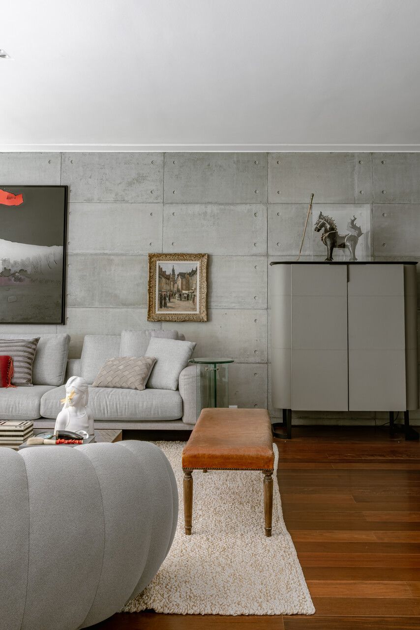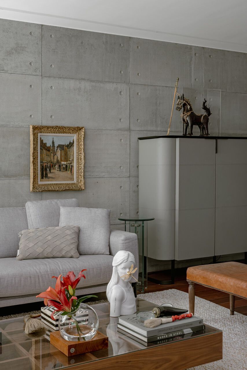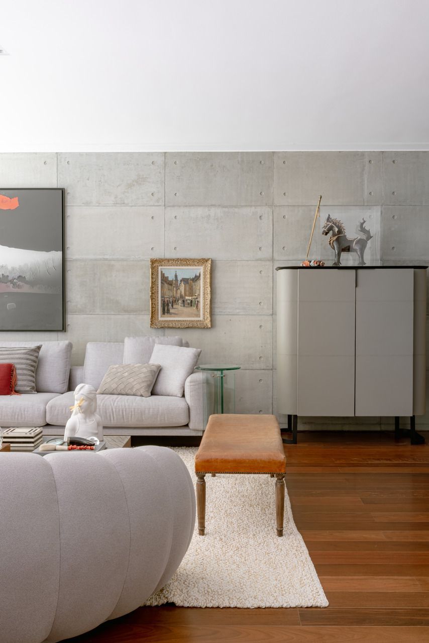 Da mesma forma, elementos originais do apartamento foram preservados, reforçando a narrativa temporal: o piso de tábua corrida, as madeiras de demolição da estante e uma nova parede de concreto aparente que funciona como ponte entre passado e presente, costurando materiais e épocas distintas.