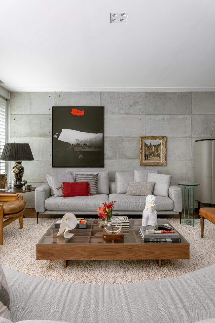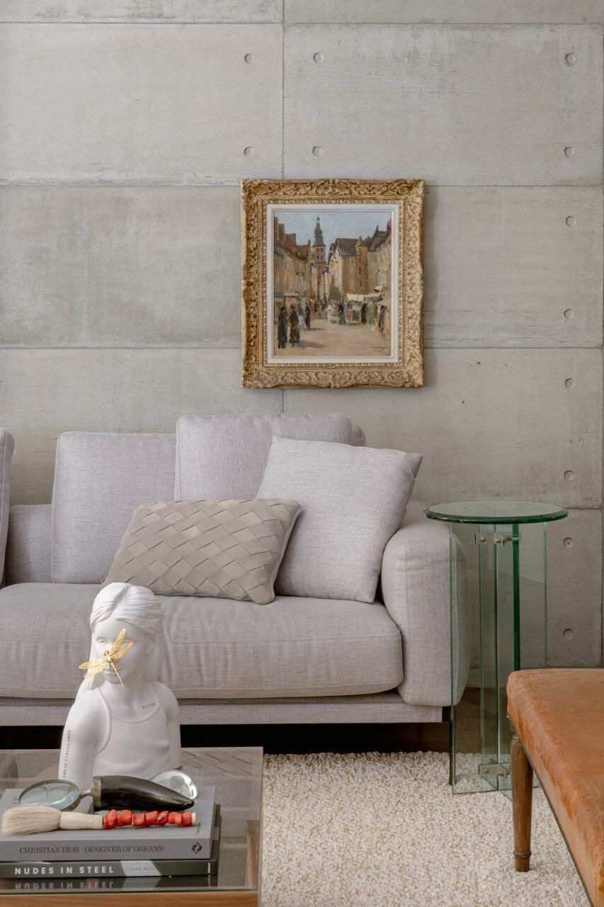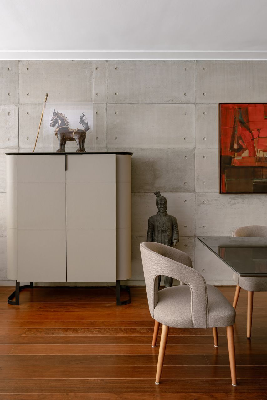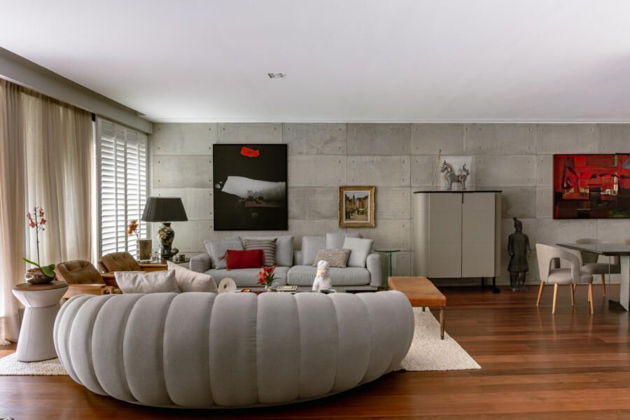 Da mesma forma, elementos originais do apartamento foram preservados, reforçando a narrativa temporal: o piso de tábua corrida, as madeiras de demolição da estante e uma nova parede de concreto aparente que funciona como ponte entre passado e presente, costurando materiais e épocas distintas.