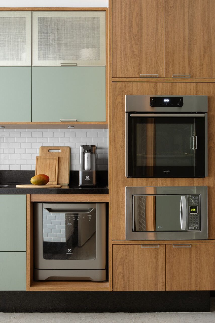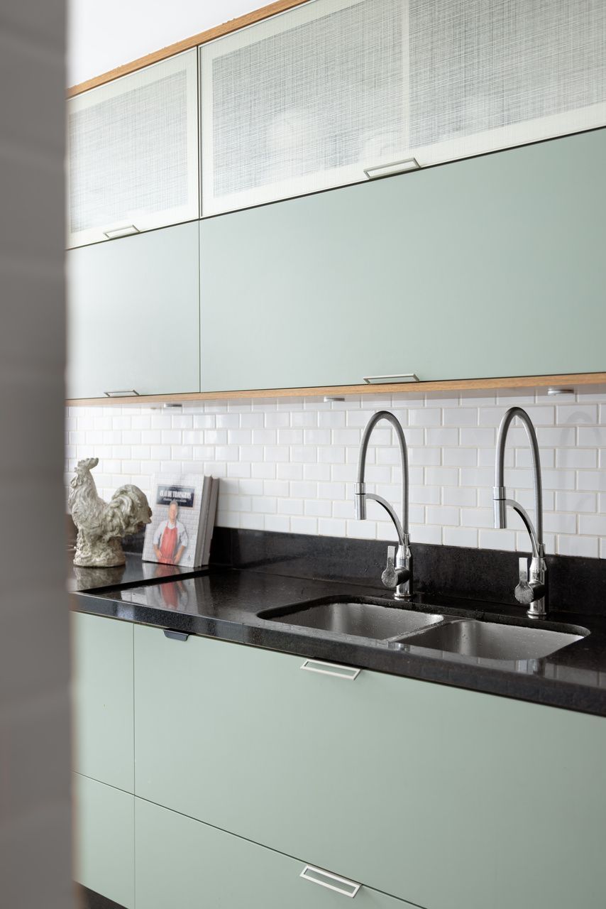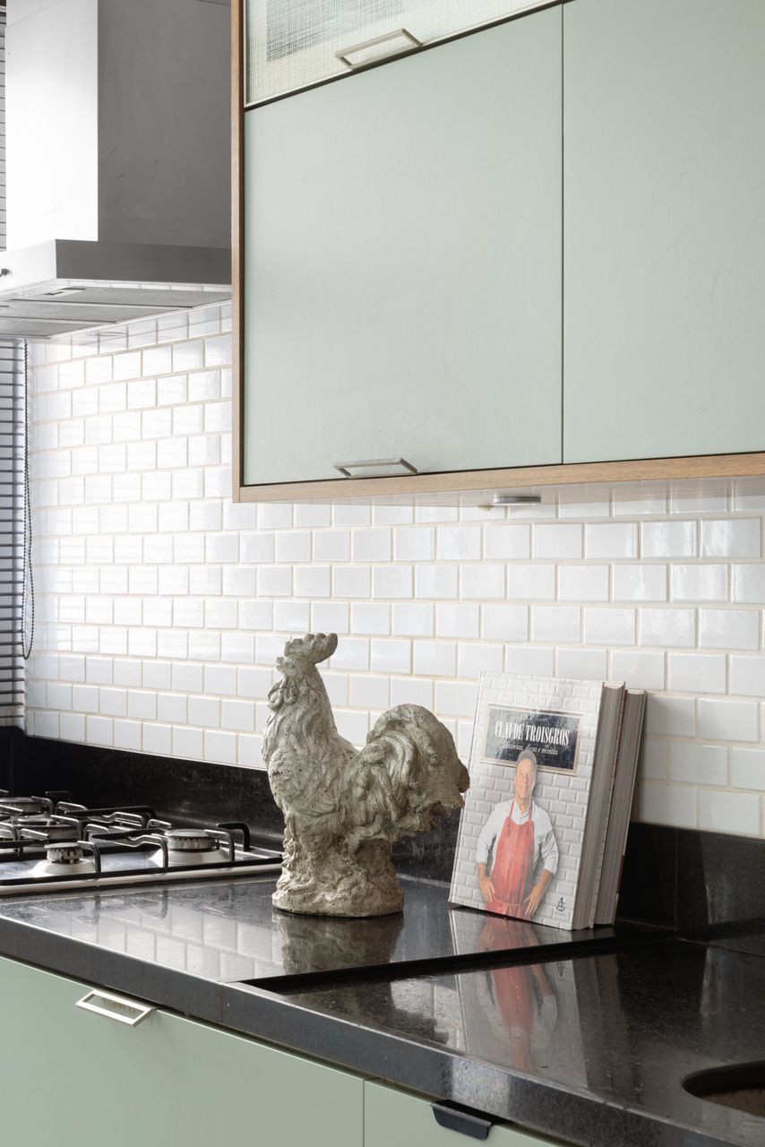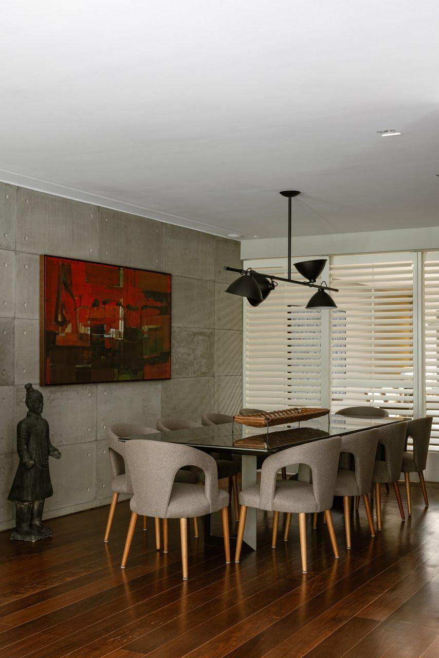 Da mesma forma, elementos originais do apartamento foram preservados, reforçando a narrativa temporal: o piso de tábua corrida, as madeiras de demolição da estante e uma nova parede de concreto aparente que funciona como ponte entre passado e presente, costurando materiais e épocas distintas.