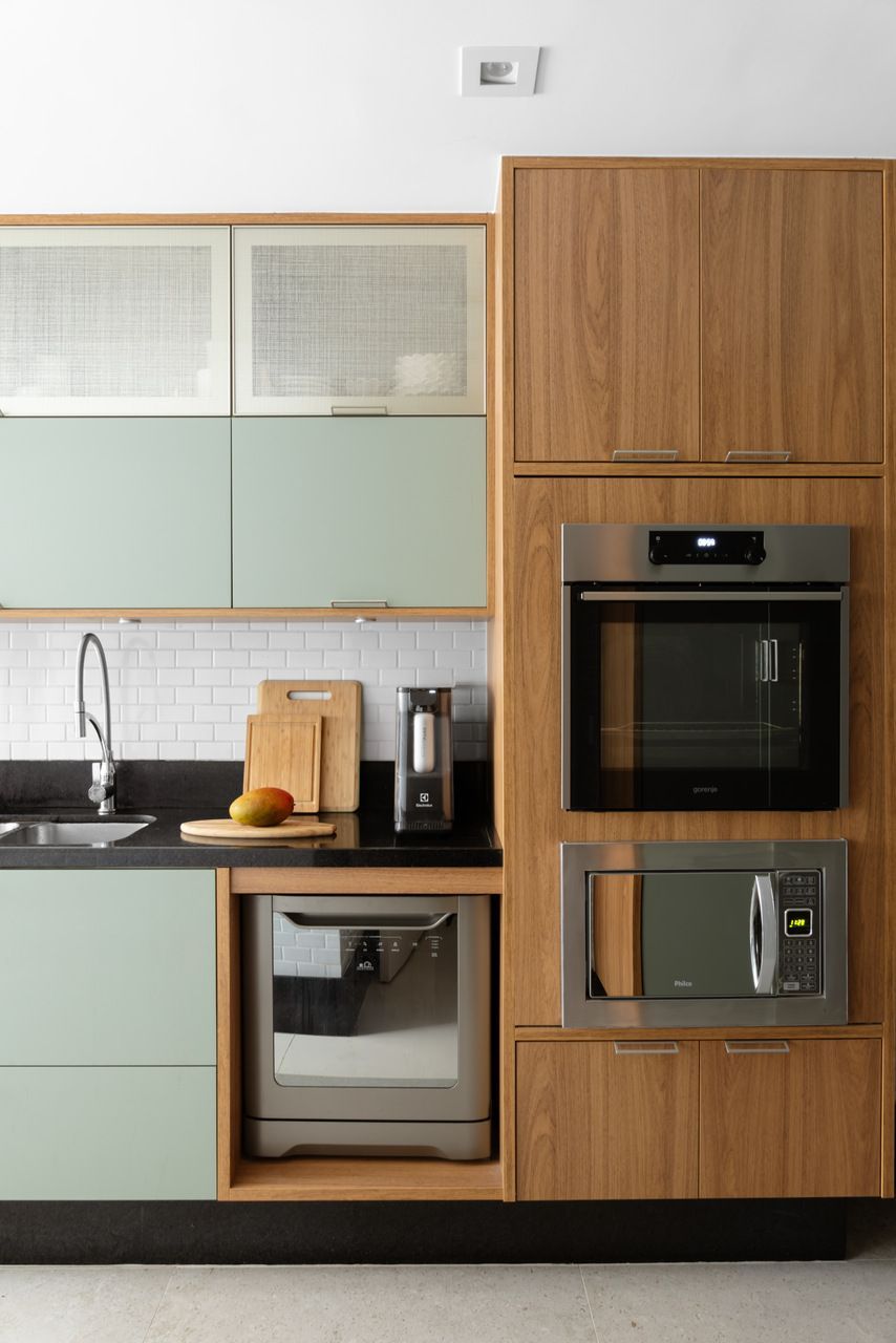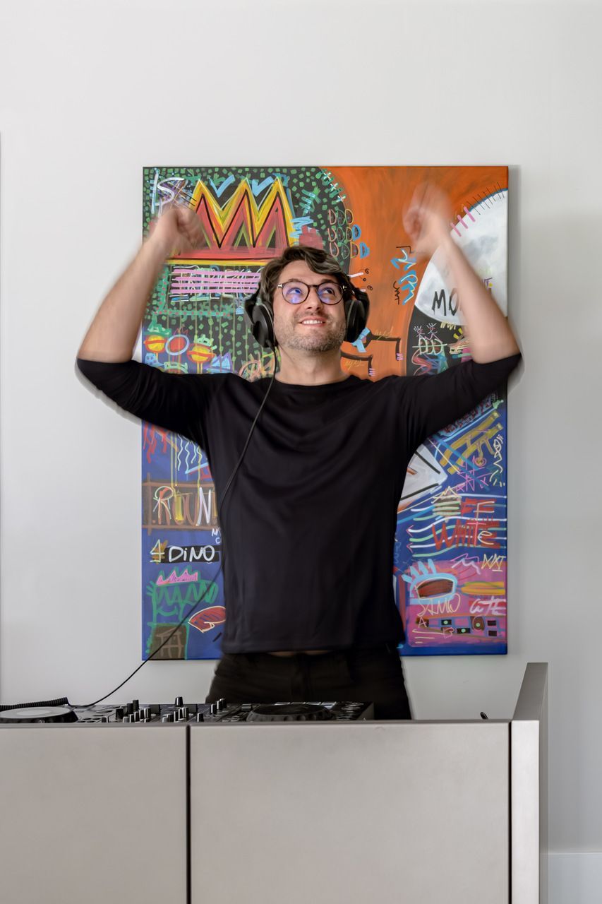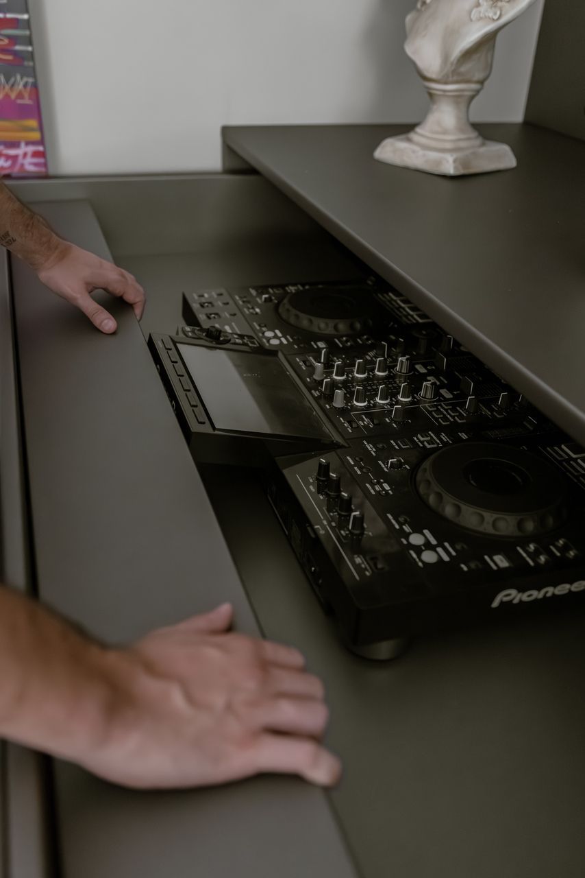 Como os arquitetos reforçam, a tomada dessas decisões mais ousadas só se sustentam quando existe confiança mútua, e foi justamente o que deu asas ao projeto. Pedidos específicos ajudaram a moldar o caráter único do lar, como a mesa de DJ desejada pelo marido, mas que não poderia permanecer exposta. A solução foi criar um ponto estratégico onde ela pudesse existir e desaparecer, mantendo o equilíbrio entre funcionalidade e discrição.