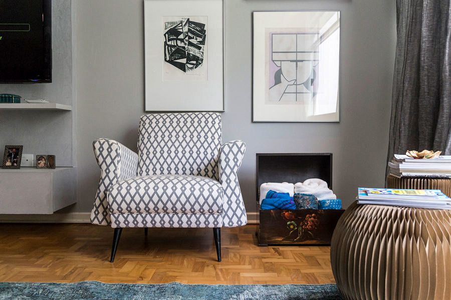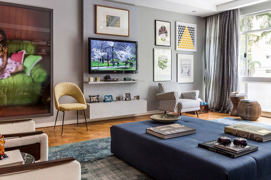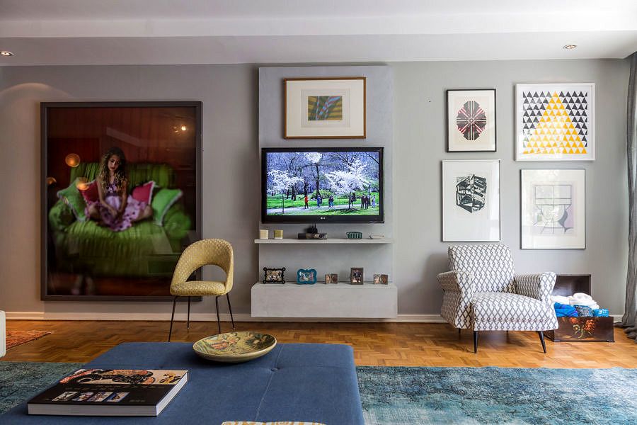 O apartamento eclético e ao mesmo tempo jovem passou por uma renovação completa assinada pelo escritório Juliana Fabrizzi Arquitetura. Um dos pedidos especiais feito pela dona é que tivesse um atelier e que ela pudesse receber as noivas pelo living.