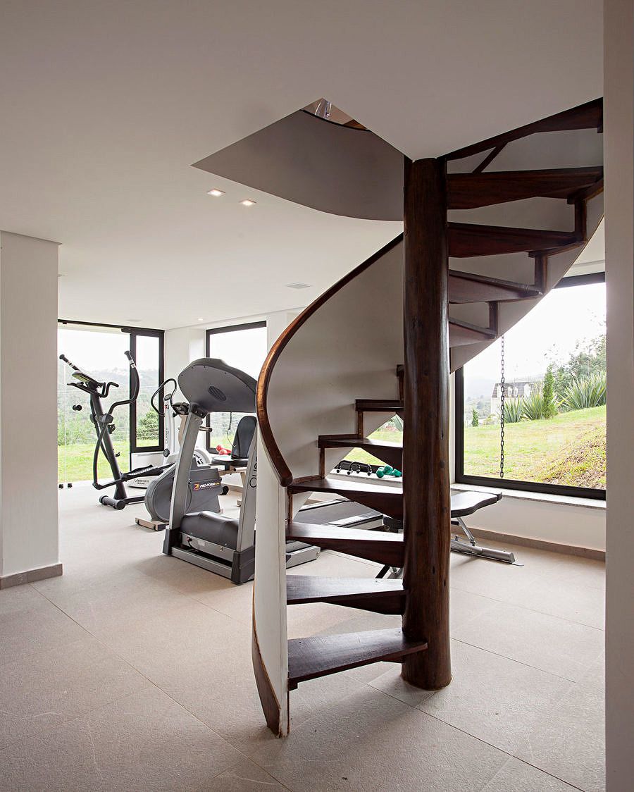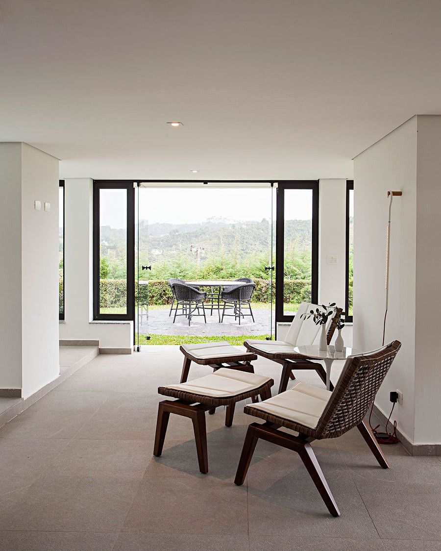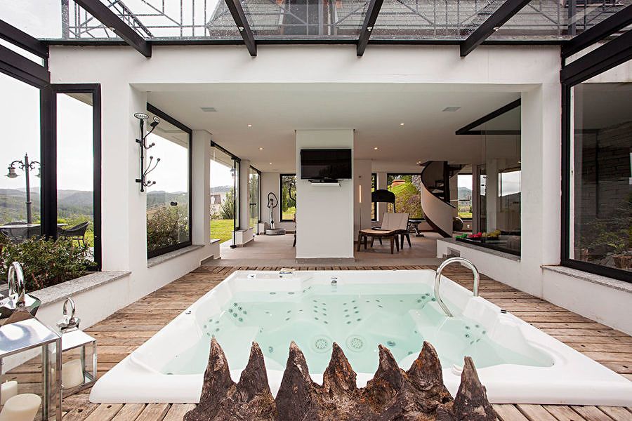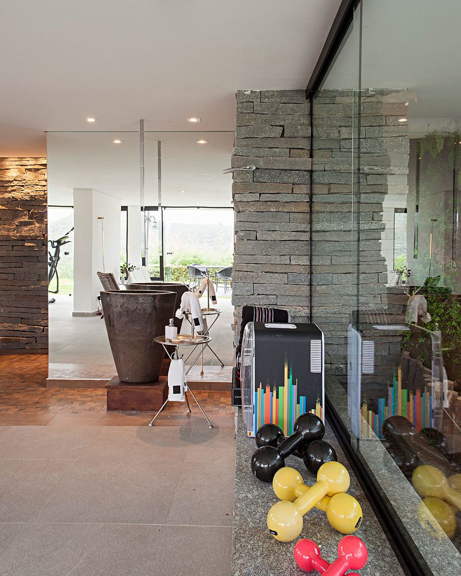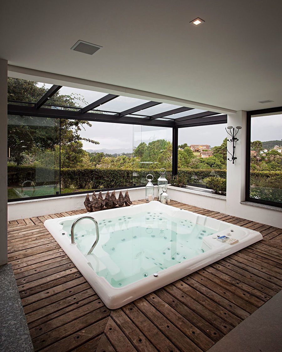 A área de lazer foi acoplada ao chalé no piso inferior, onde anteriormente só havia a estrutura da antiga casa. Assim foi criada uma área para a hidromassagem, o fitness, sauna, banho e descanso. Envidraçada em todo perímetro, uma vista de contemplação: jardim externo e paisagem natural.