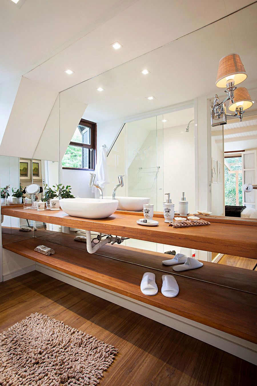 A reforma foi concebida para abrigar três suítes e uma mini cozinha para pequenas refeições. Pensando no clima e no bem estar dos netos, a casa também precisava proporcionar ambientes para sala de TV e brinquedos. O pedido foi atendido no mezanino superior junto ao quarto das crianças.