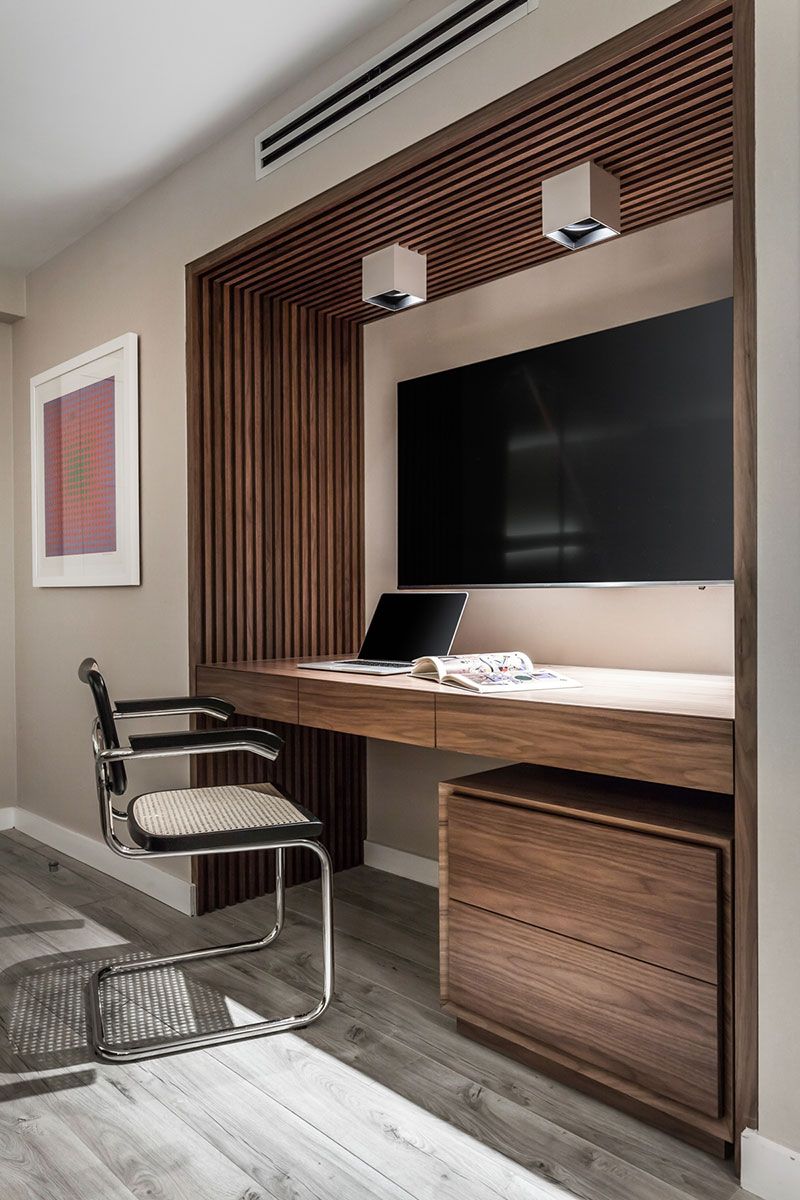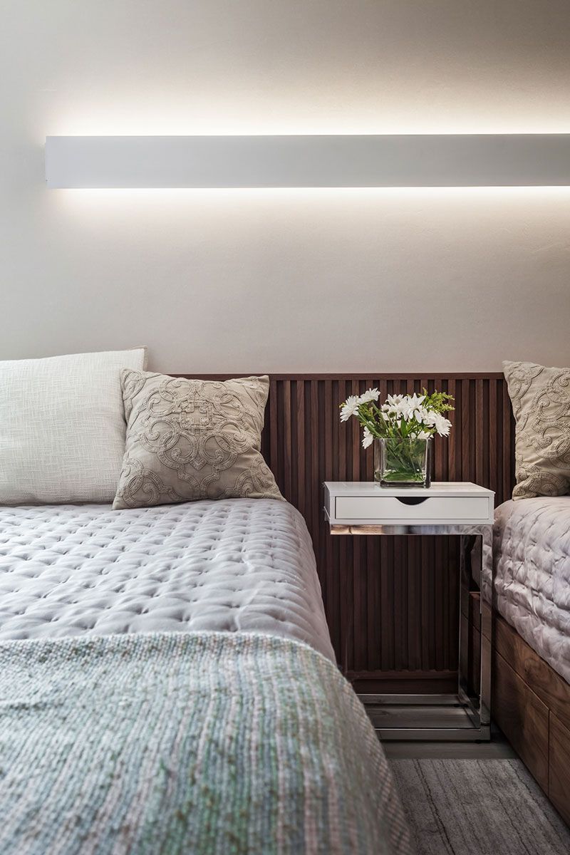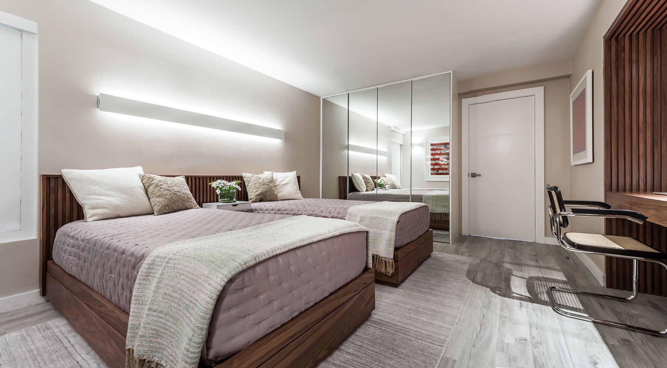 Para solucionar, os profissionais utilizaram a marcenaria para maximizar os ambientes, por exemplo, o gaveteiro/escritório na suíte master e bicamas na suíte dos filhos. Além disso, a utilização de espelhos nas portas do closet e na sala de jantar deixa a sensação de que o ambiente é maior.