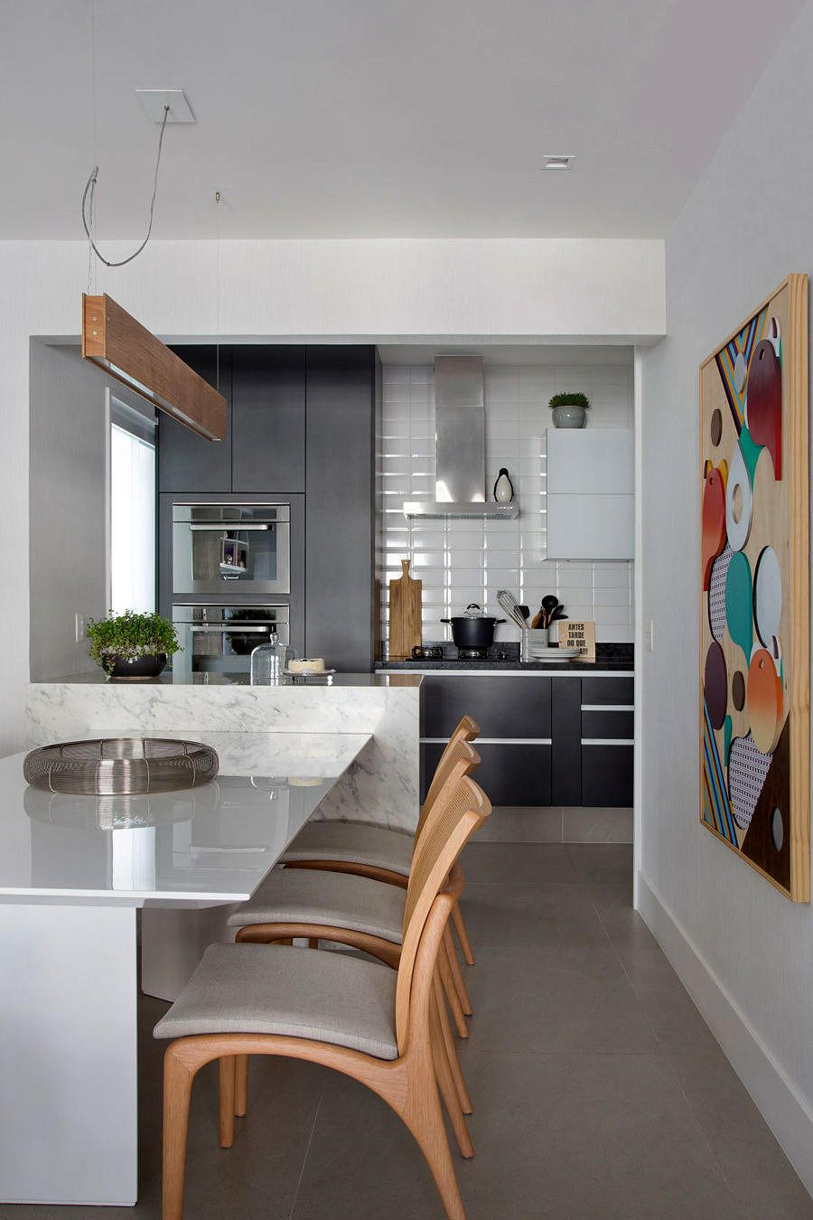 Assim que comprou o apê de 120 m² o novo proprietário procurou o escritório Bezamat Arquitetura, pois já conhecia e gostava das profissionais, para reformar e decorar o imóvel. Os pedidos especiais que o cliente fez foram: um bar e uma cozinha aberta.