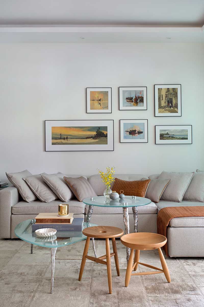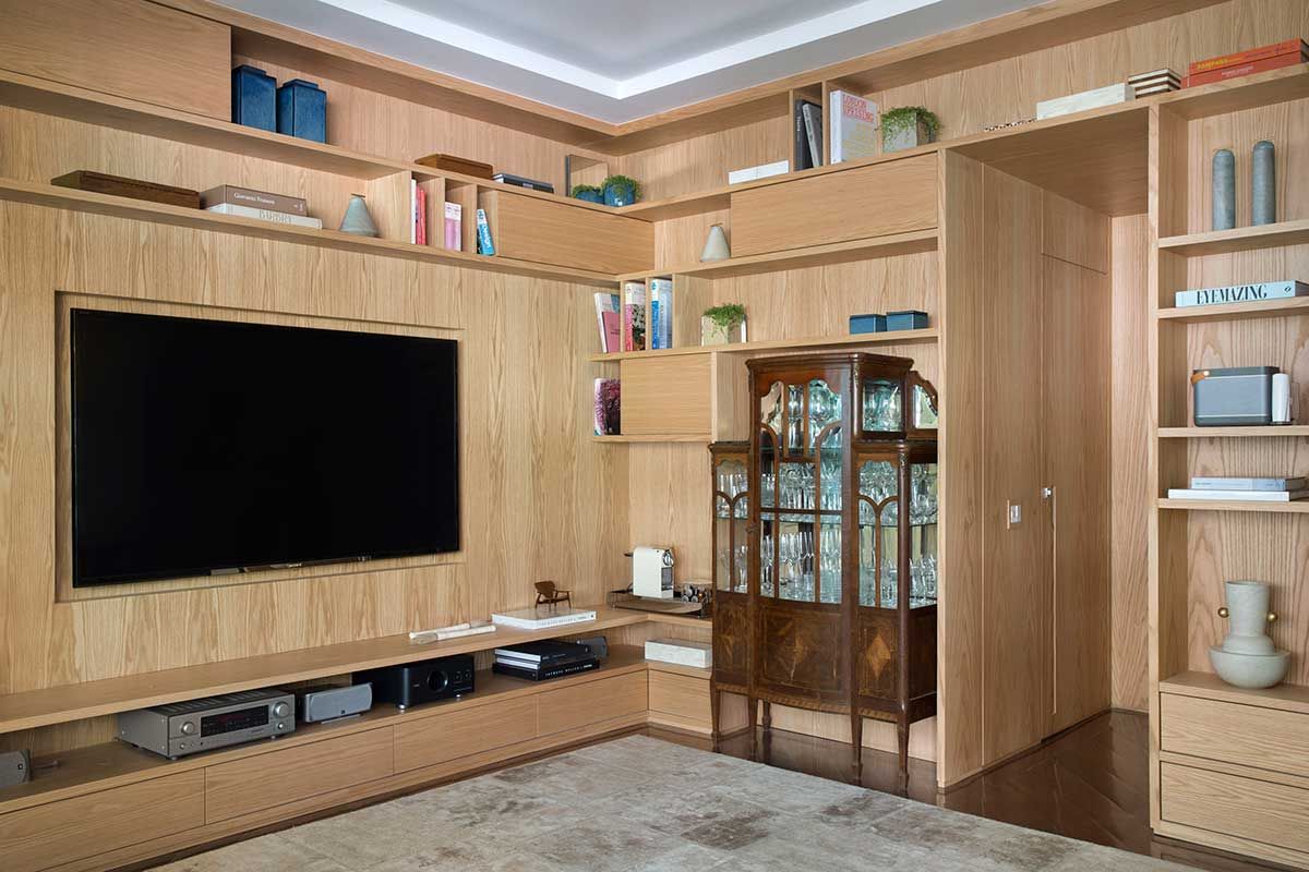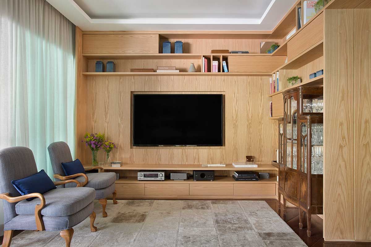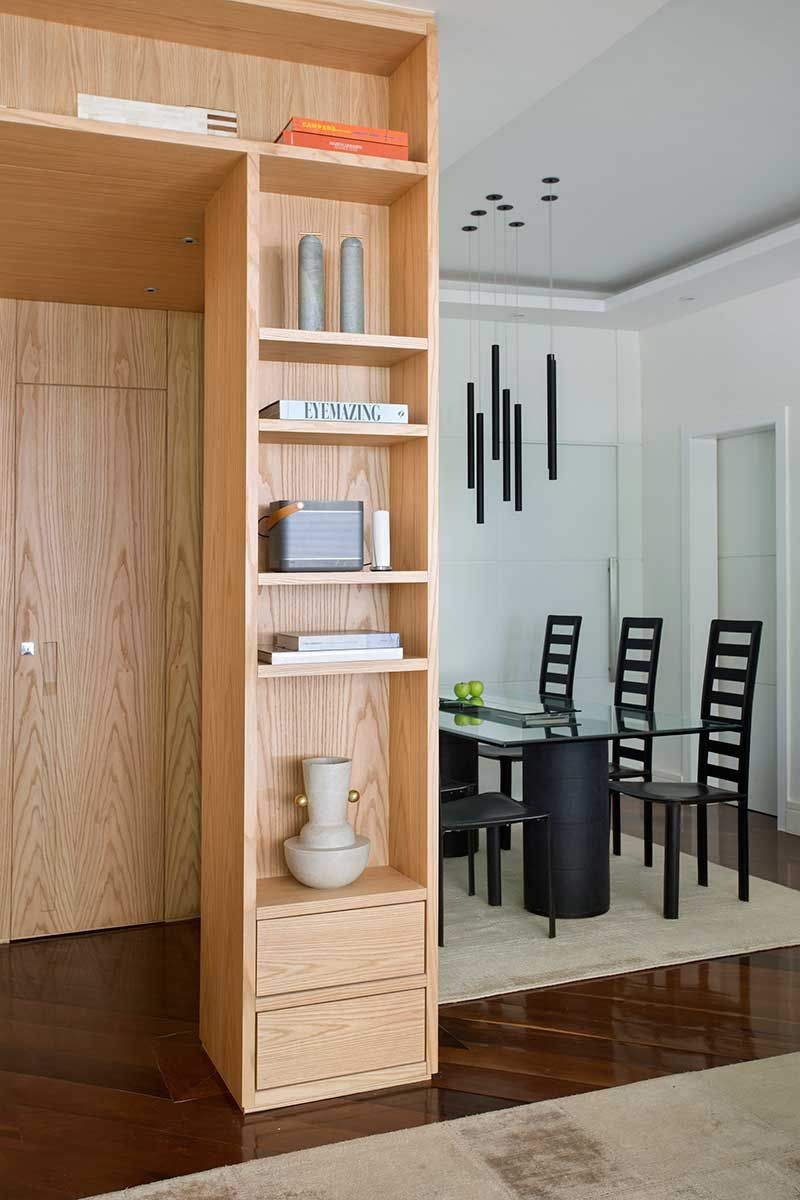 Para esse novo layout proposto, elegemos juntos os móveis que seriam mantidos, repaginamos poltronas e sofás – alternando tecidos neutros com estamparia – e escolhemos as novas peças, priorizando sempre o máximo de conforto. O hall foi todo revestido em painel de marcenaria com as portas de entrada e do lavabo em detalhe faceado ao painel, como se fosse um nicho da estante.