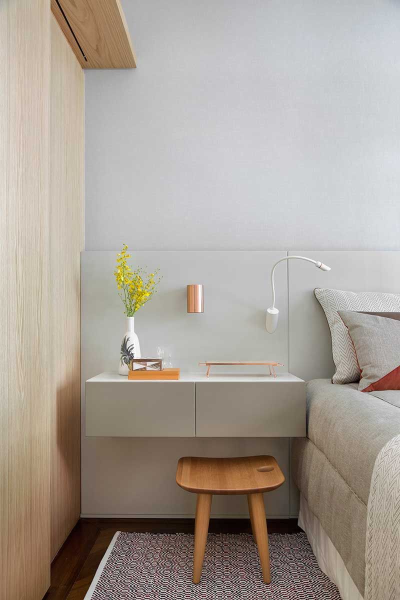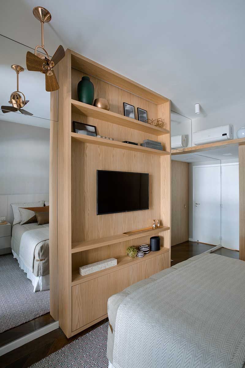 No quarto do casal também foi usado o painel de marcenaria para revestir o volume do closet. Uma prateleira esconde o split e cria espaço para a decoração. A estante em frente à cama funciona como painel de TV, tem nichos decorativos abertos e embaixo na base porta báscula para sapateira.