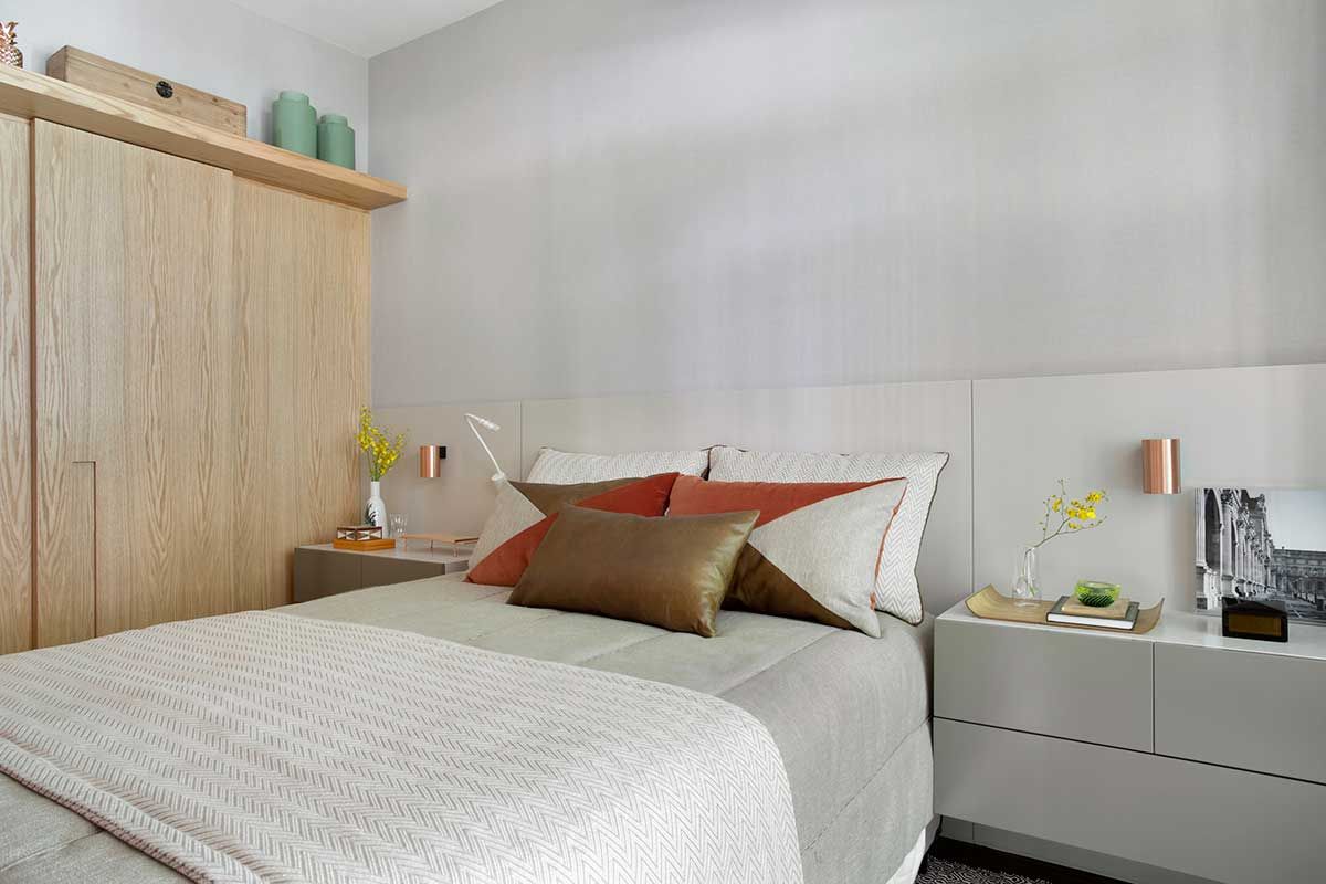 A iluminação foi bastante planejada e deixou tudo ainda mais aconchegante. Com a luz geral e luz indireta, iluminando a marcenaria e o papel de parede, por trás do painel de cabeceira, arandelas pontuais em cobre e luminária para leitura na cama.