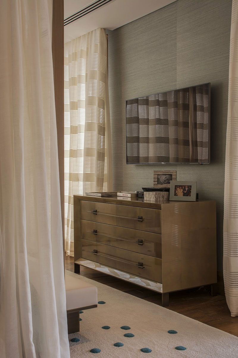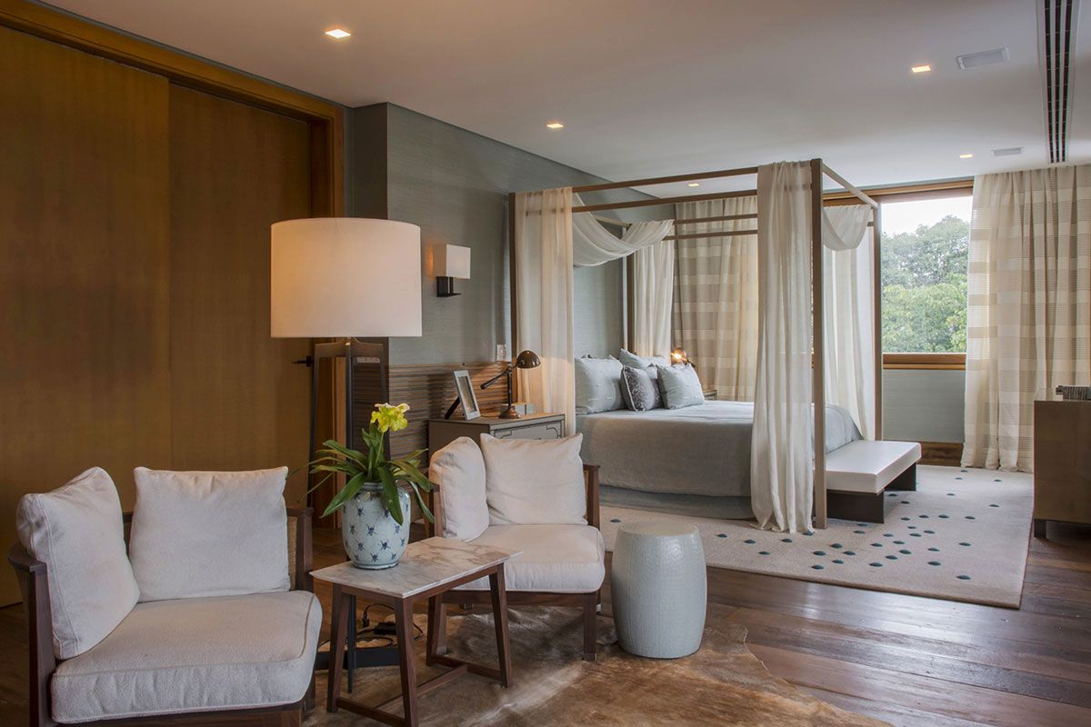 A ideia do escritório Denise Barretto Arquitetura foi criar para o casal de clientes um quarto de campo suave com uma bela varanda. Os revestimentos adotados foram palha italiana acqua e assoalho em canela desgastado. O projeto foi composto a partir das inúmeras janelas e portas para o terraço.