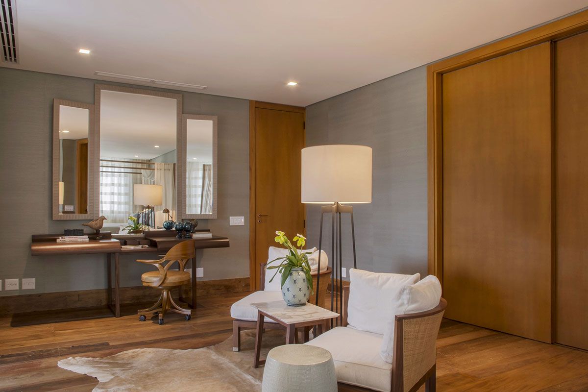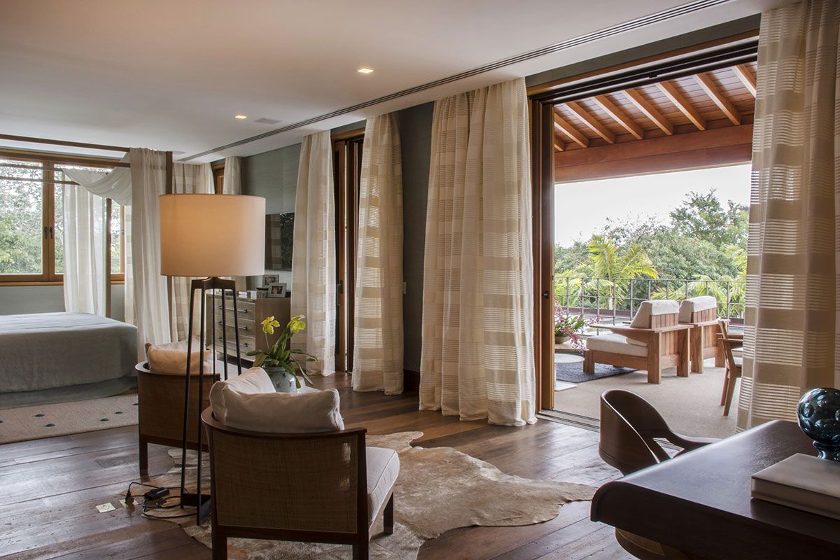 A ideia do escritório Denise Barretto Arquitetura foi criar para o casal de clientes um quarto de campo suave com uma bela varanda. Os revestimentos adotados foram palha italiana acqua e assoalho em canela desgastado. O projeto foi composto a partir das inúmeras janelas e portas para o terraço.