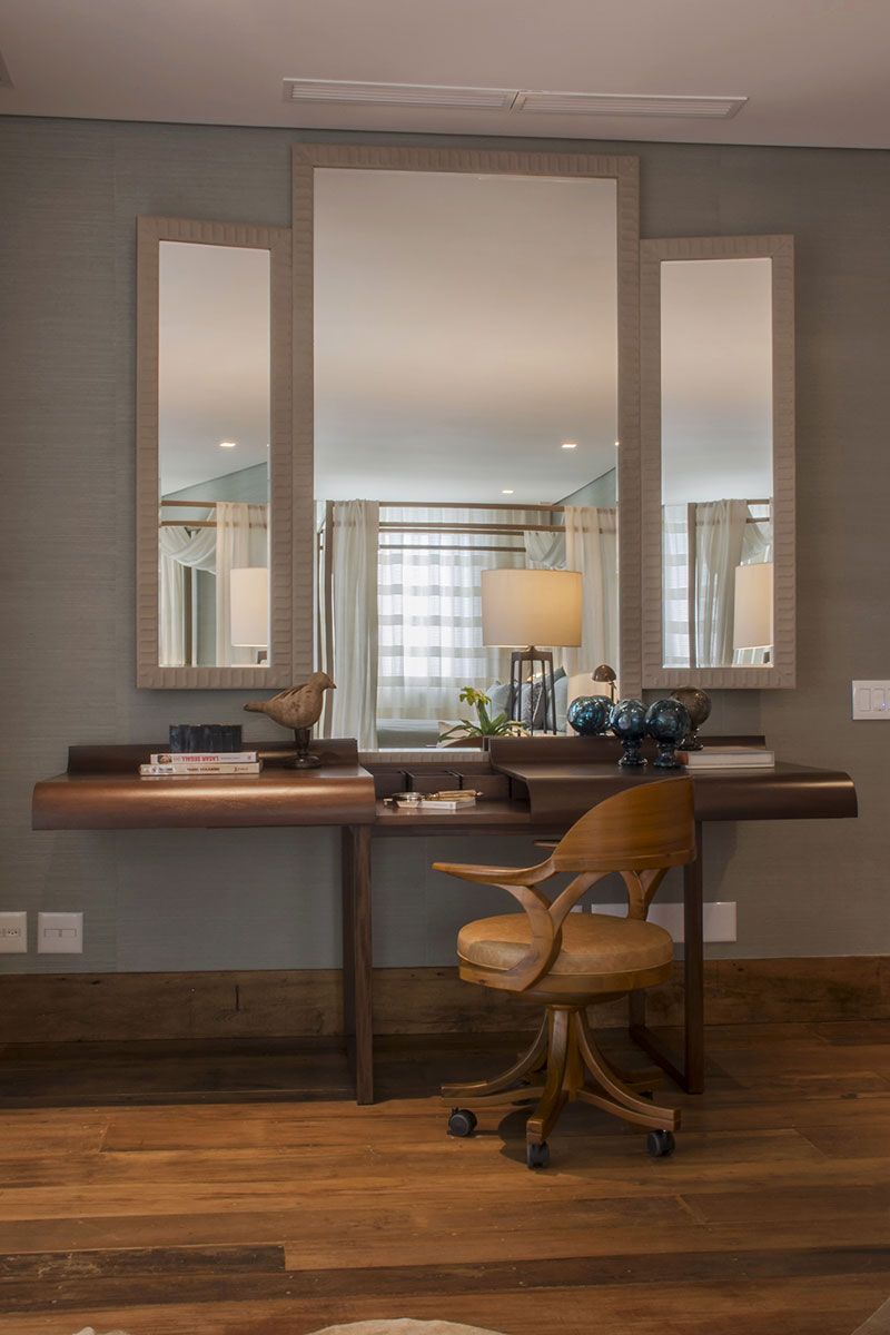 Outros dois recintos foram criados: a penteadeira composta da escrivaninha Etel, em nogueira, e do espelho, do Empório Beraldin, design de Denise Barretto, e o pequeno estar delimitado pela pele no assoalho, que resultou em um espaço para conversar e curtir a vista.